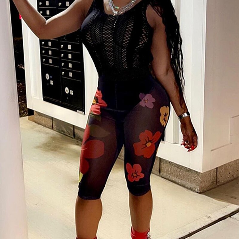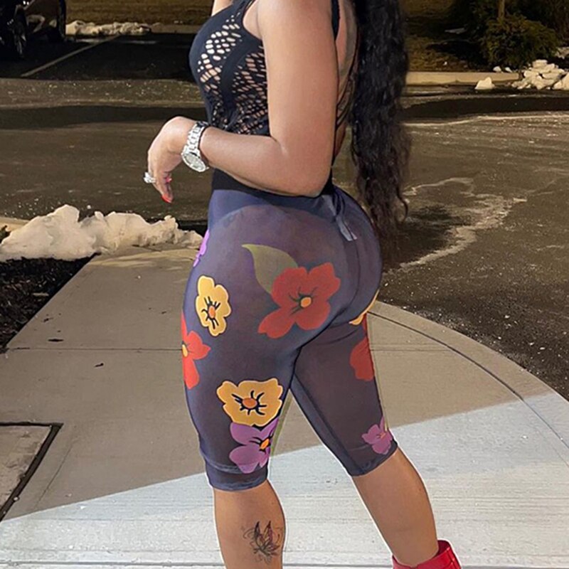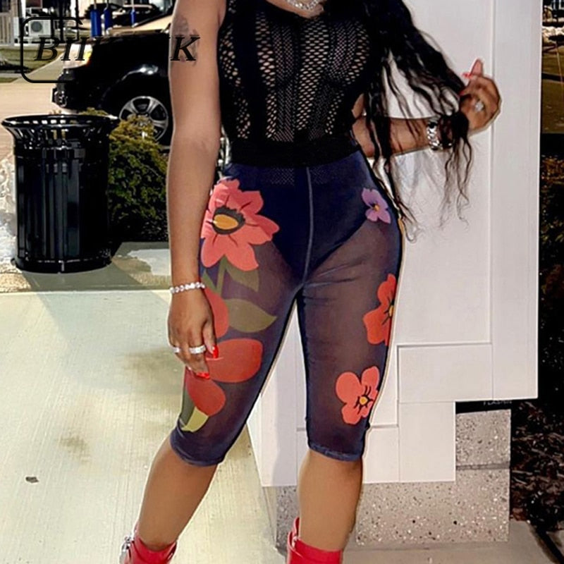 BIIKPIIK Flowers Print Skinny High Waist Shorts Women Fashion Streetwear Casual Knee-length Bottoms See-through Mesh Sexy Shorts