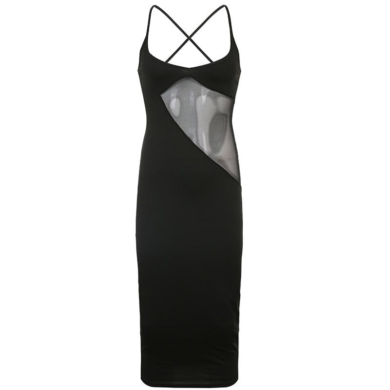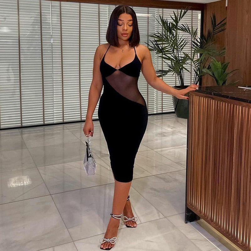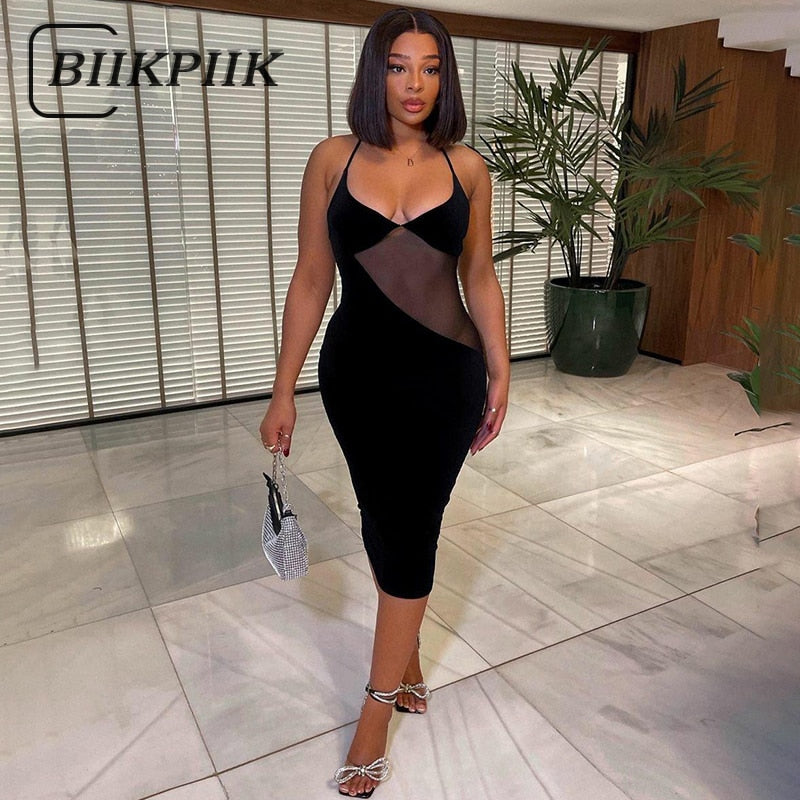 BIIKPIIK Halter Charming Midi Dress Women Sexy Sleeveless Patchwork Black Knee-length Slim Female Partywear Fashionable Dresses
