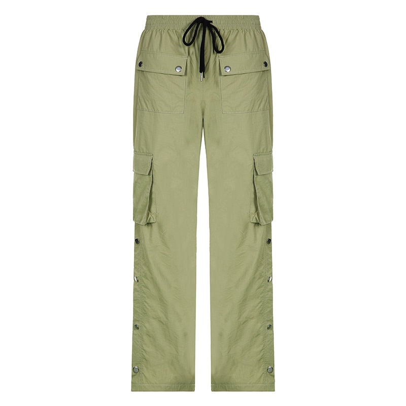 BIIKPIIK High Street Women's Cargo Pants Harajuku Mid Waist Drawstring Buttons Pockets Straight Trousers Female Punk Solid Pant