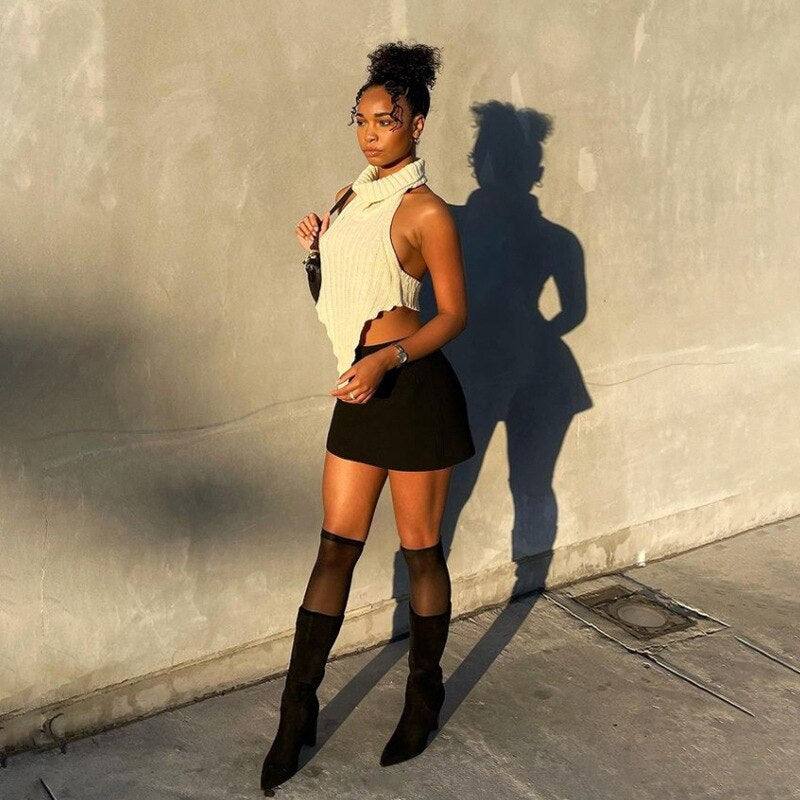 BIIKPIIK Knitted Vest For Women Turtleneck Casual Streetwear Fashion T-shirts Backless Sleeveless Hot Sexy All-match Female Tops