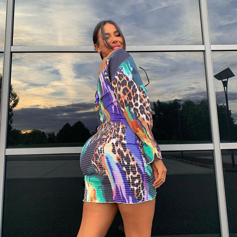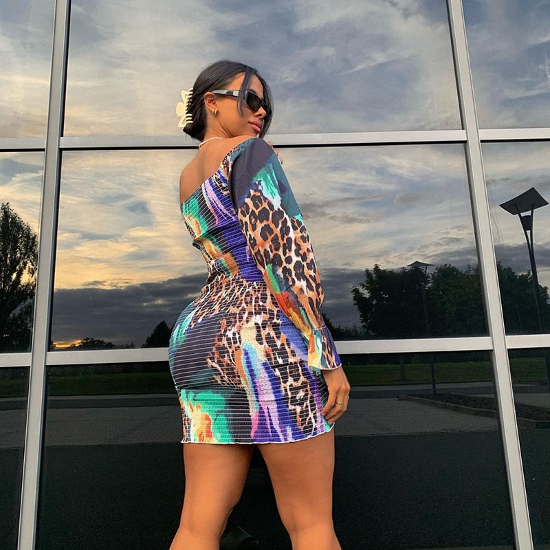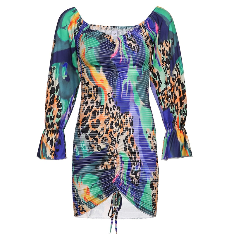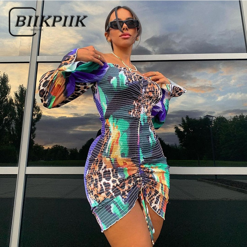BIIKPIIK Leopard Print Shirring Mini Dress Elegant Sexy Slash Neck Long Sleeve Dress Women Bodycon Party Clubwear Outfits Casual