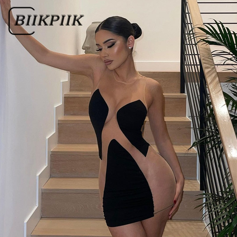 BIIKPIIK Mesh Patchwork Mini Dress Elegant Women Transparent Sleeveless O-Neck Bodycon Party Clubwear Clothing Fashion Dresses