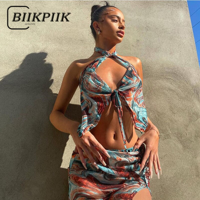 BIIKPIIK Print Women Skirts Sets Lace Evening Clubwear Vacation 2 Piece Set Outifits Female Suits Hollow Out Sexy Casual Clothes