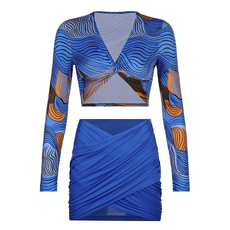 BIIKPIIK Sexy 2-piece Set Women Cross V neck Spring Long Sleeve T-shirts + Mini Skirts Club Party Vaction Stretchy Matching Suit