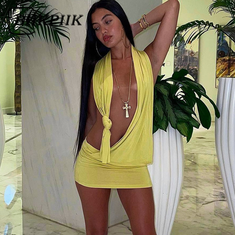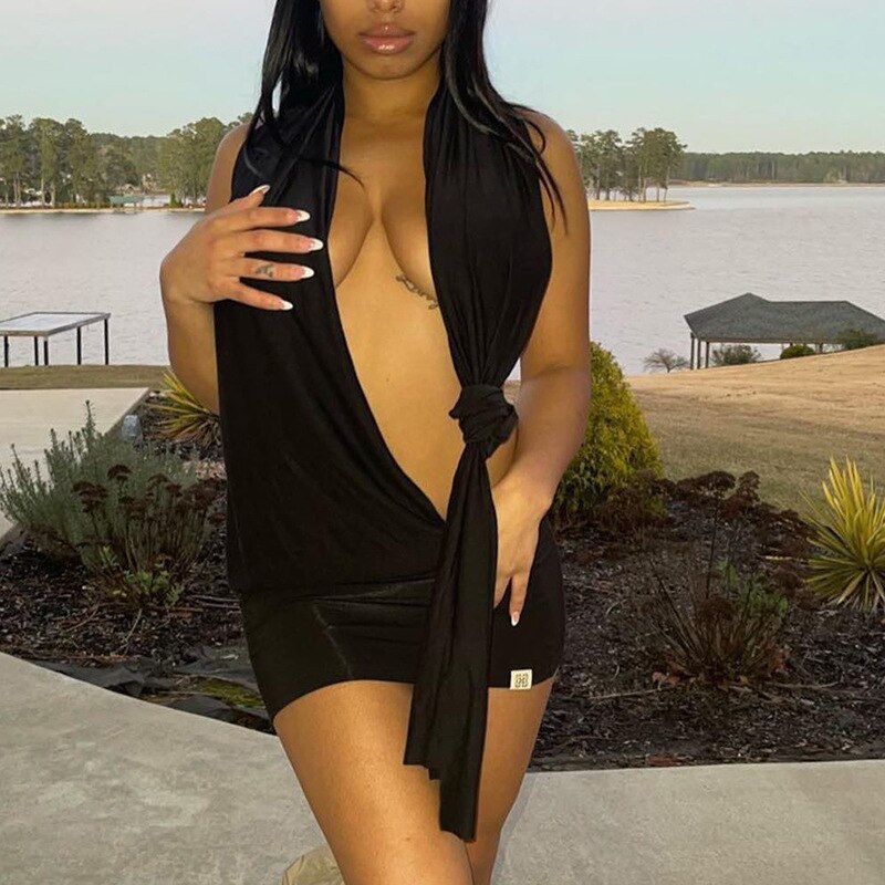 BIIKPIIK Solid Casual Cut Outs Halter Backless Short Dress Women Bandage Knot Sleeveless Beach Holiday Clothing Baggy Sexy Dress