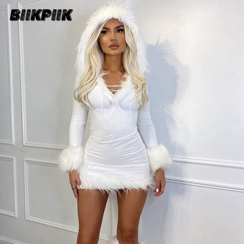 BIIKPIIK Solid Drawstring Women MIni Dress Hoodied Hollow Out Sexy Bodycon Clubwear Autumn Shaggy Dresses Casual Clothes