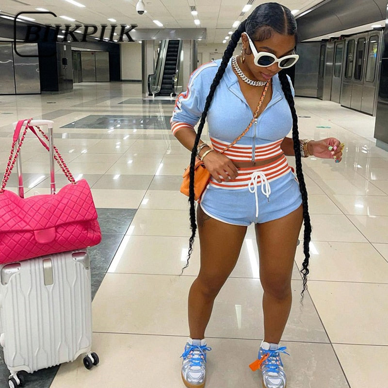 BIIKPIIK Two Piece Sets Women Macthing Outfits Casual Zipper-up Long Sleeve Tops And Drawstring Shorts Female Sporty Tracksuits