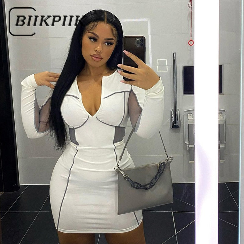 BIIKPIIK Women Mini Simple Patchwork Bodycon Dress Long Sleeve Low-cut Cleavage Lounge Streetwear Autumn Winter Stretchy Dresses
