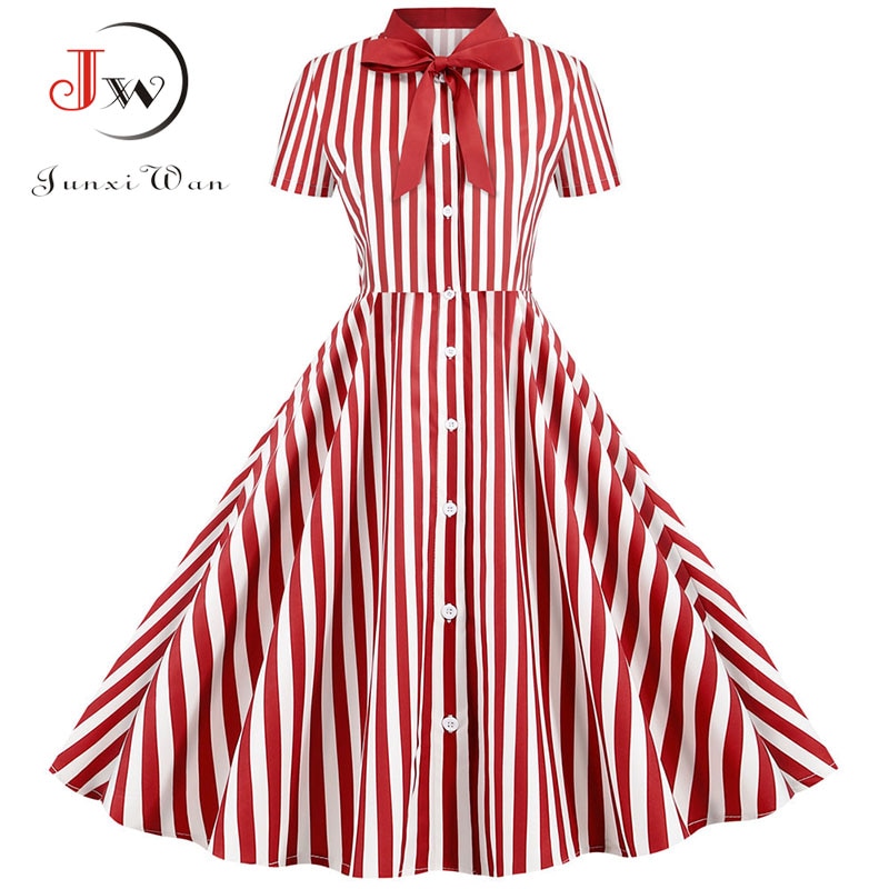 Black Polka Dot Print Women Summer Dress Short Sleeve Striped Bow Elegant Vintage Pin Up 50s Party Dress Vestidos