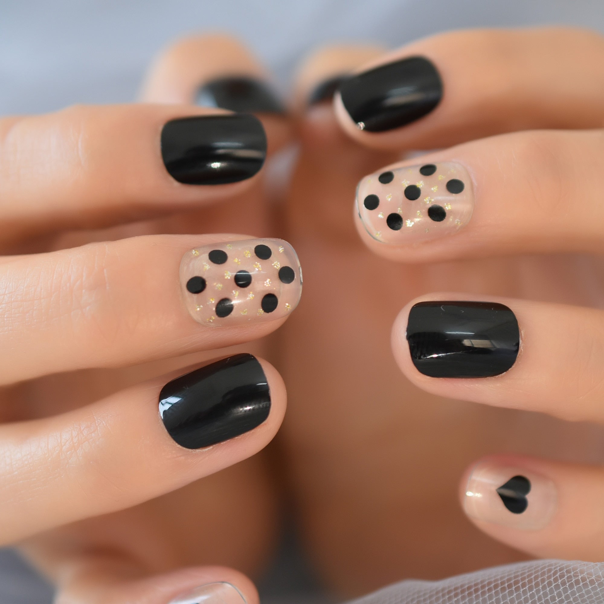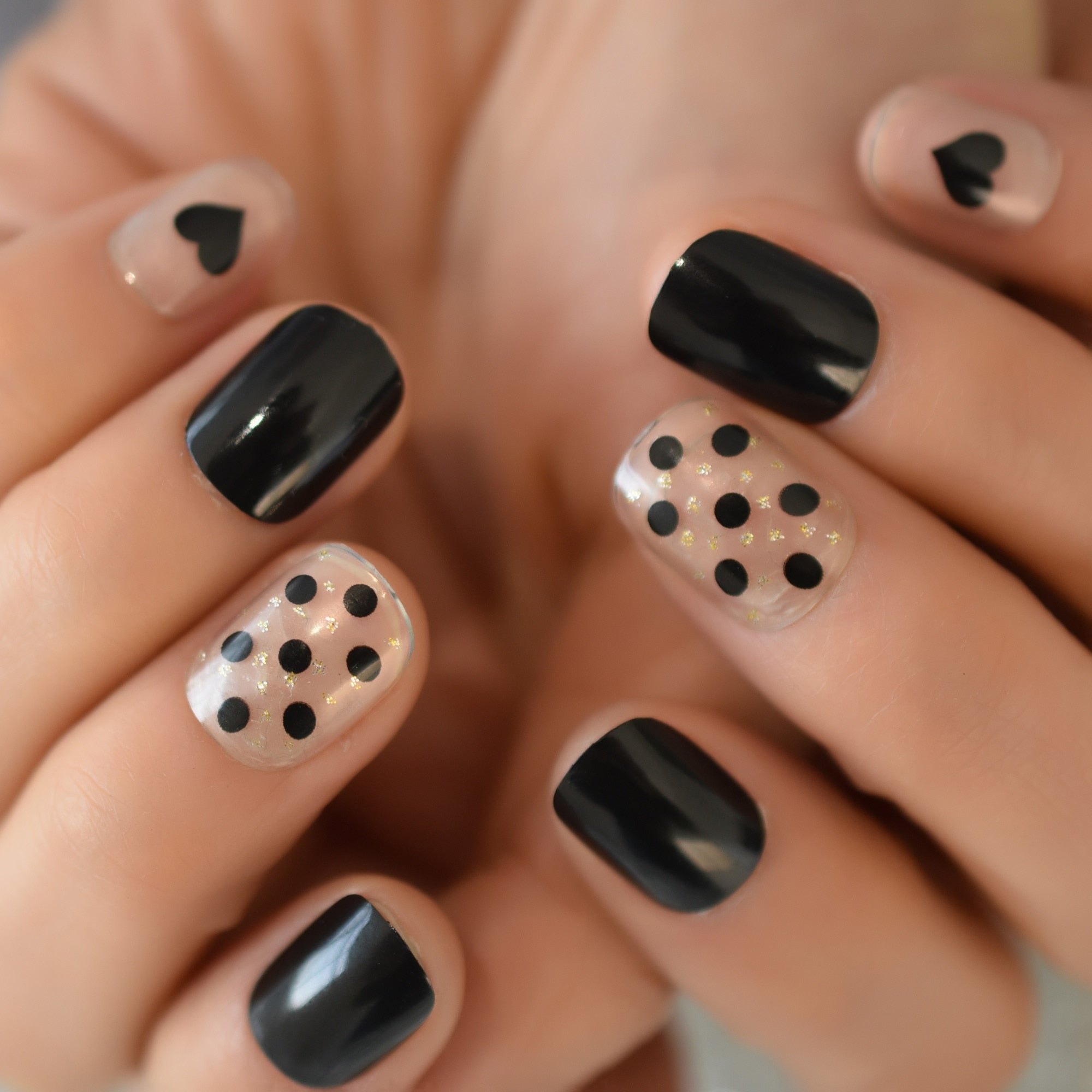 Black Round Tips False Nails Heart Speckle Decorative Clear Thin Gel Coating Fake Nail With Adhesive Sticker-Nail Inspo