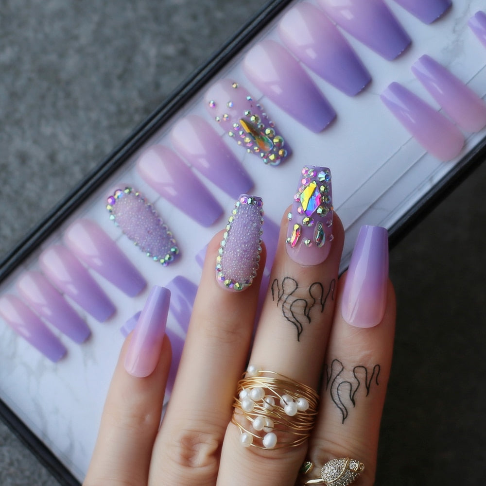 Box gift ombre Purple Lavender coffin false nails Crystal design design caviar Shaped drill Trapezoid fake nails Custom logo-Nail Inspo