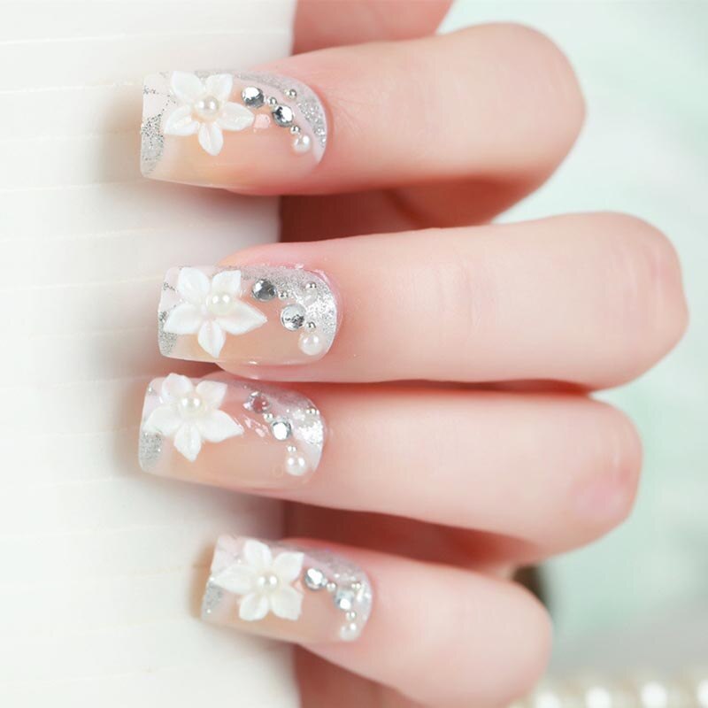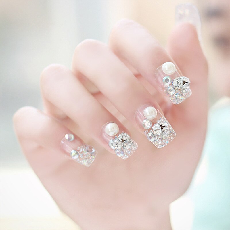 Bride Shining Rhinestone Wedding False Nails Ladies Simple Fashion French Fake Nails White Beige Acrylic Nail Tips With Glue-Nail Inspo