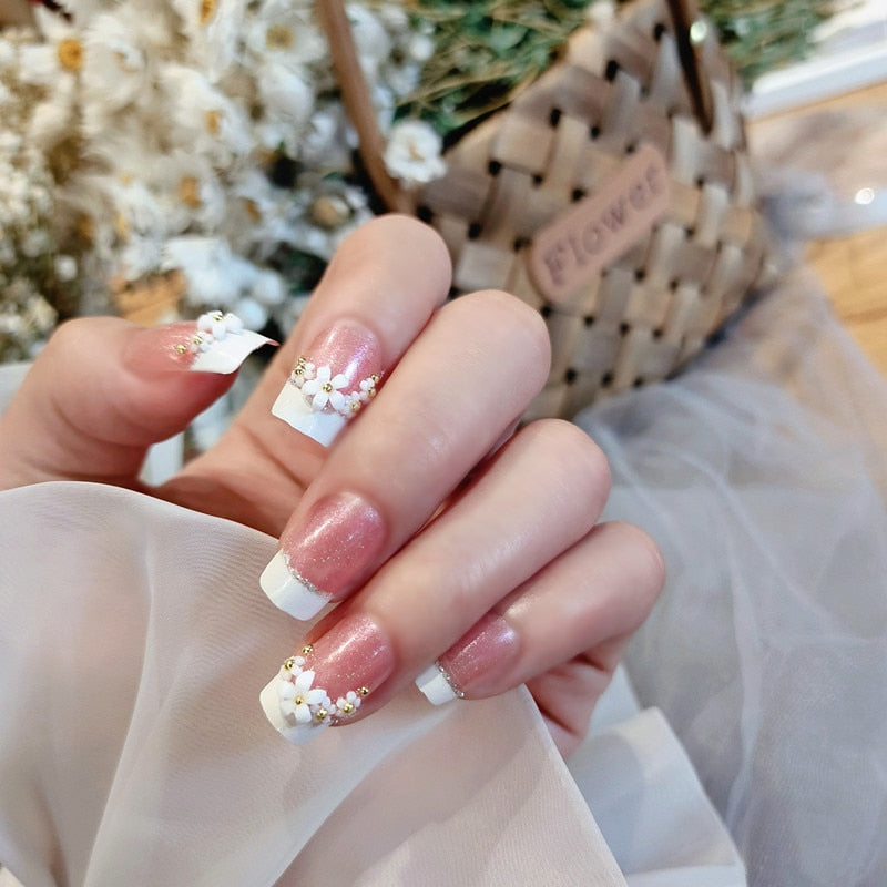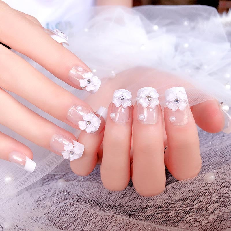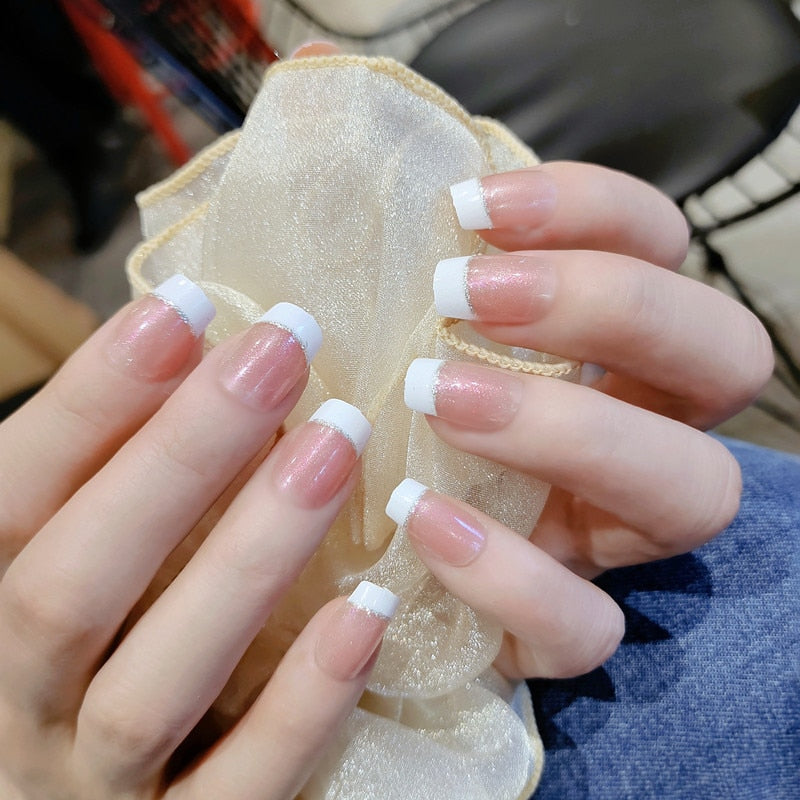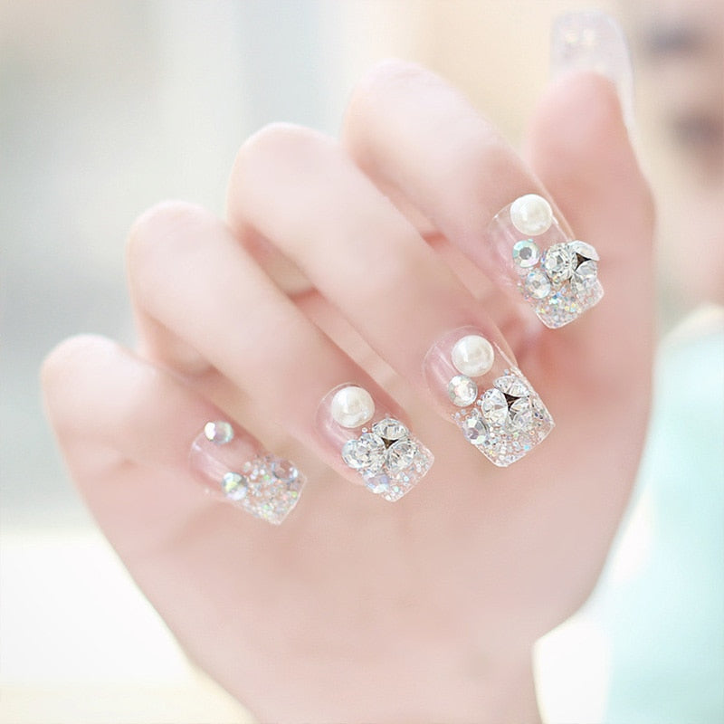 Bride Shining Rhinestone Wedding False Nails Ladies Simple Fashion French Fake Nails White Beige Acrylic Nail Tips With Glue-Nail Inspo