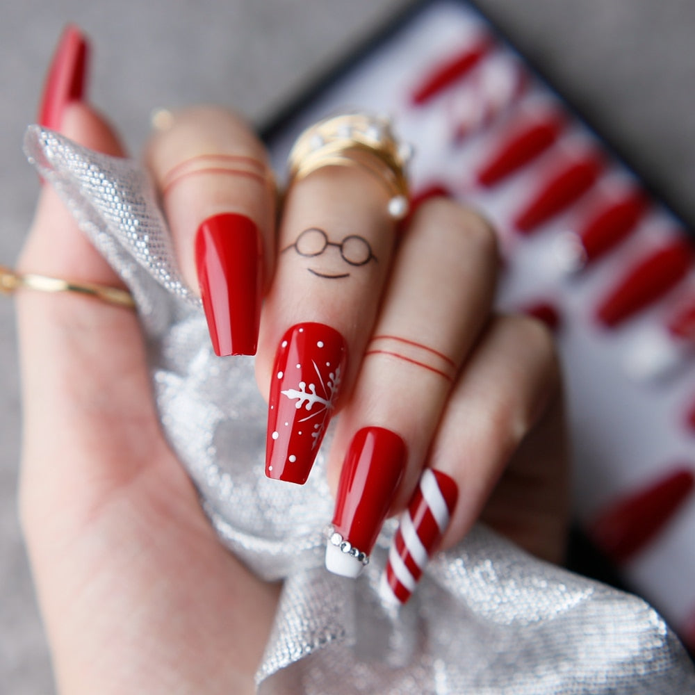 Christmas candycane Coffin False nails with box  Acrylic crystal DIY Style Art Fake nalis Tips Press on nails Snow Christmas hat-Nail Inspo