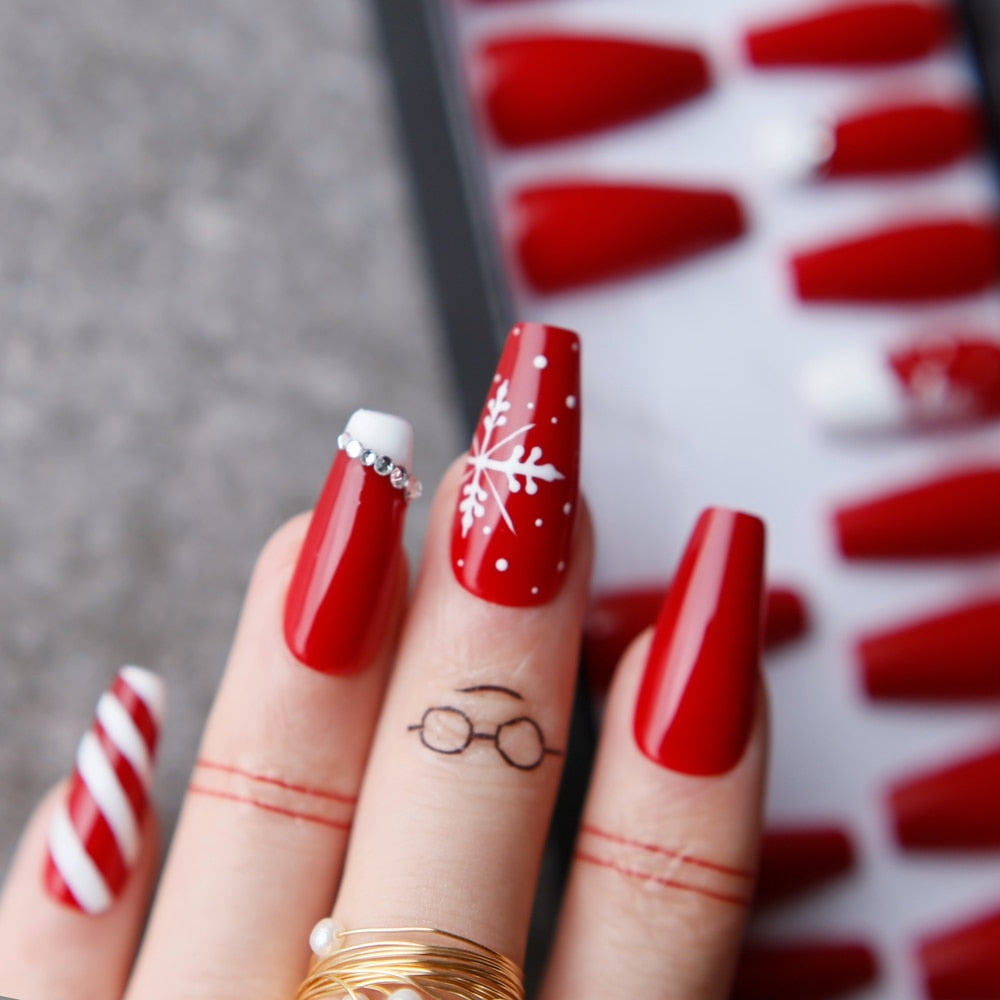 Christmas candycane Coffin False nails with box Acrylic crystal DIY Style Art Fake nalis Tips Press on nails Snow Christmas hat-Nail Inspo