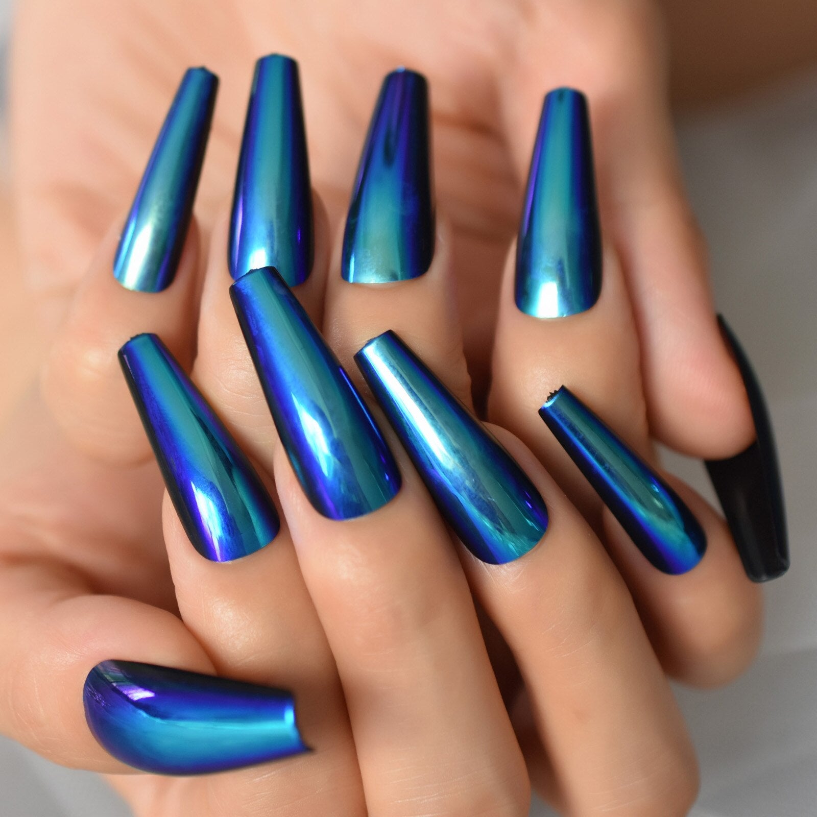 Chrome Metallic Fake Nails Set Mirror Extra Long Press On Nails Coffin Ballerina Blue Acrylic False Nail Art Tips For Women-Nail Inspo