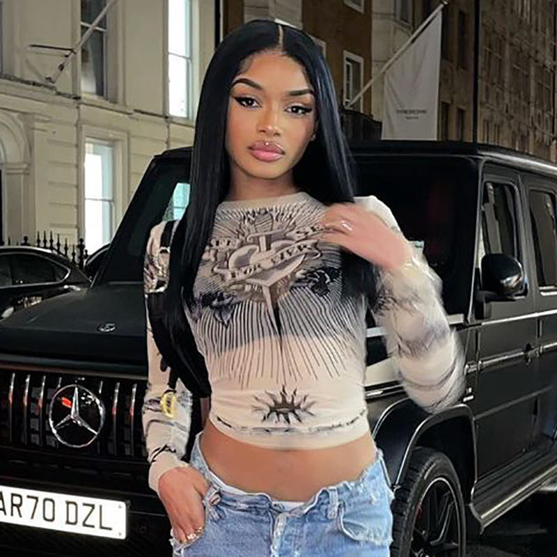 Churchf 2024 Autumn New Round-Neck Long-Sleeved Head Print Micro-Permeable Casual Women's Top