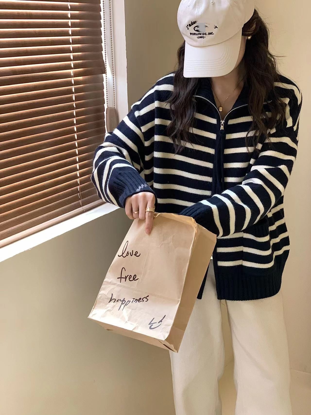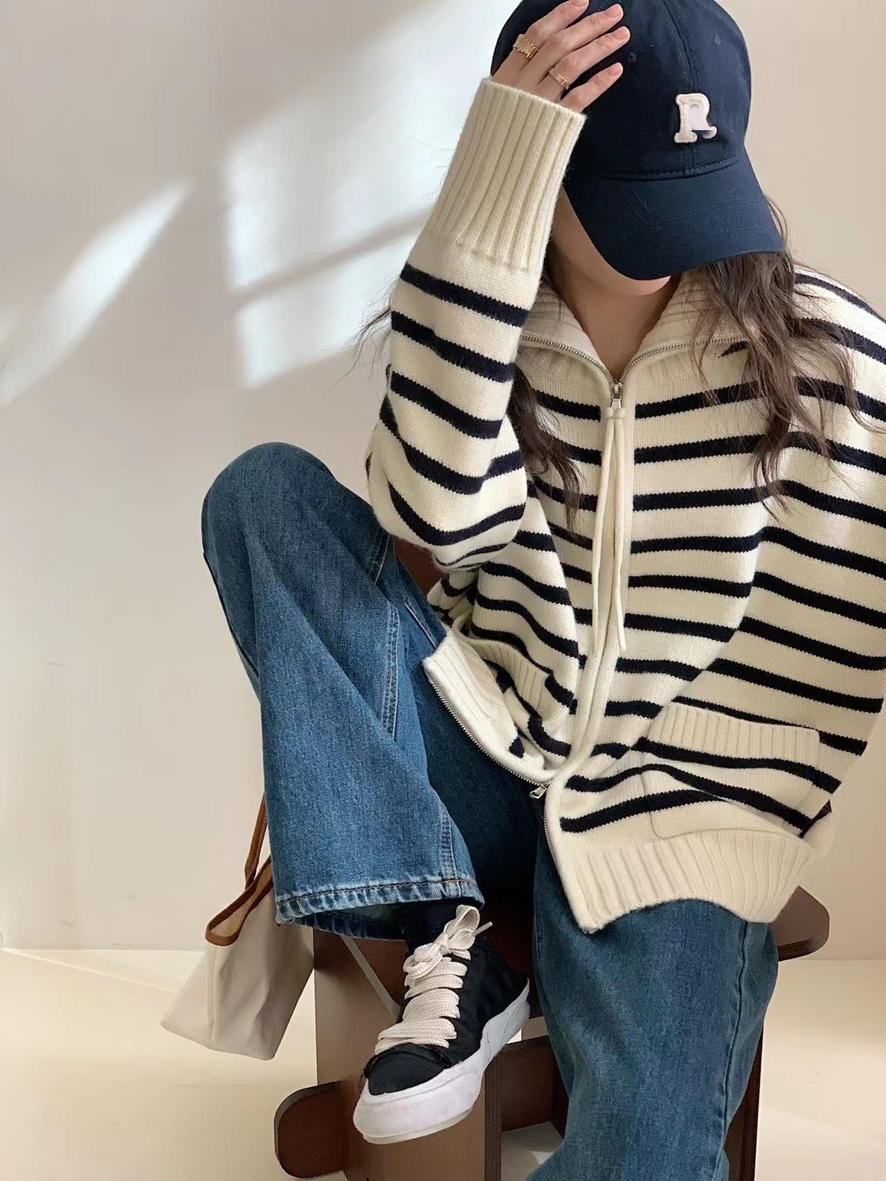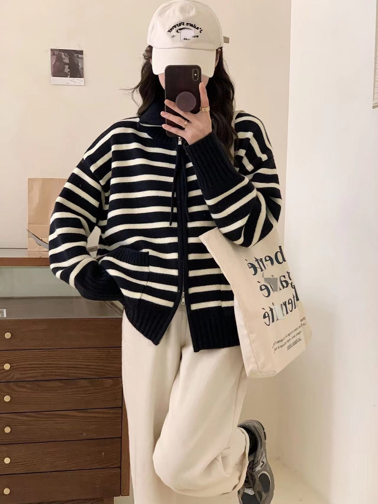 Churchf Churchf Lapel Stripe Double Zipper Knit Cardigan Women's 2024 New Loose And Versatile Thin Sweater Coat