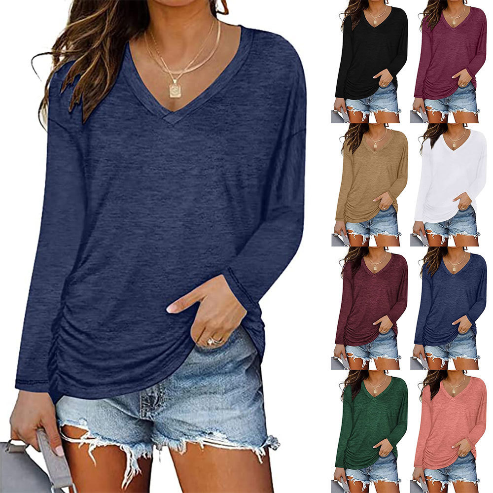 Churchf Churchf New 2023 Autumn / Winter 2023 Women's V-Neck Pleated Long Sleeve T-Shirt Solid Color Loose Casual Top