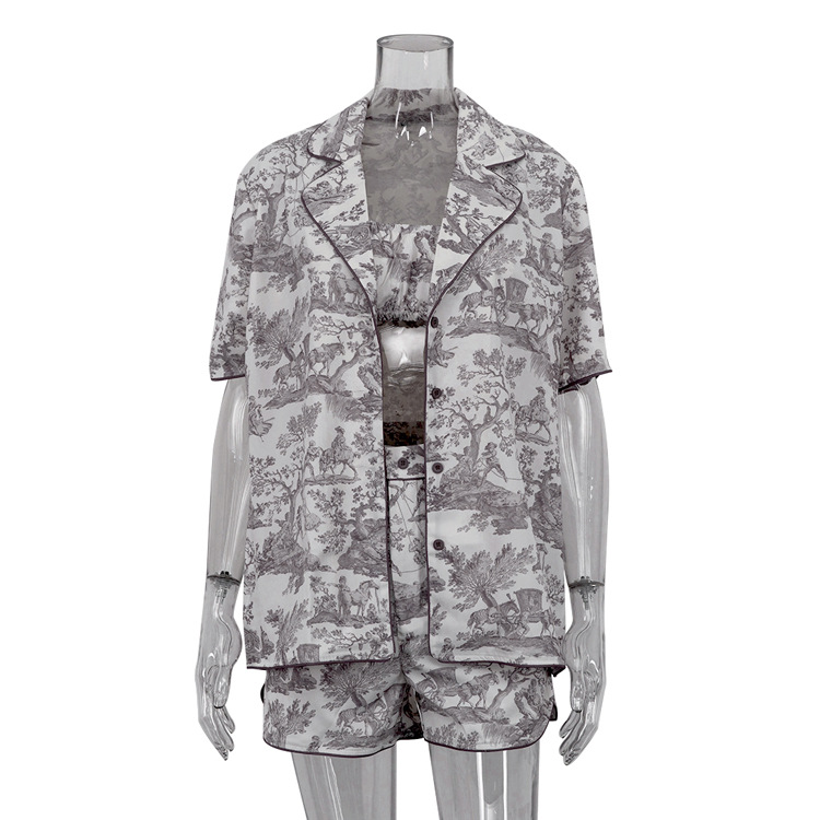 Churchf Churchf New Chinese Style Ink Print Shirt Sling Shorts Three-Piece Retro Fashion Suit Women's Wear