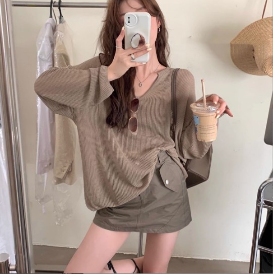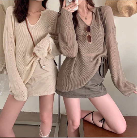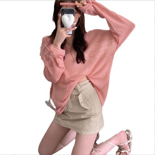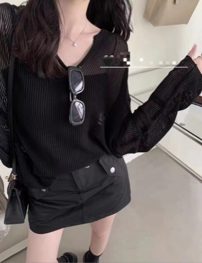 Churchf Churchf New Korean Loose Lazy Wind Long Sleeve Large Version V-Neck Ice Silk Jacket Women's Spring And Summer Thin Hollow Out Sweater