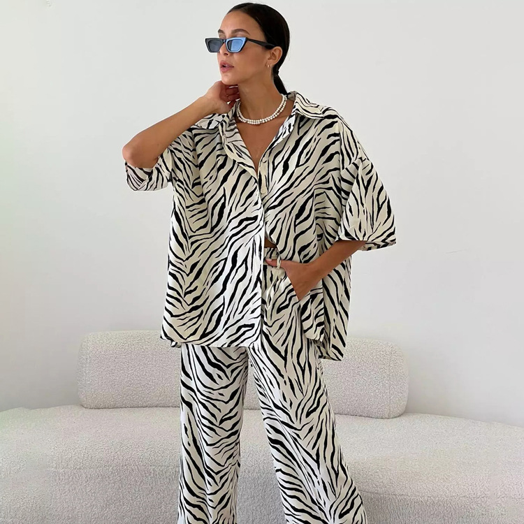Churchf Churchf Satin Zebra Striped Suit Female 2023 Summer Short Sleeve Shirt High Waist Trousers Two-Piece Set