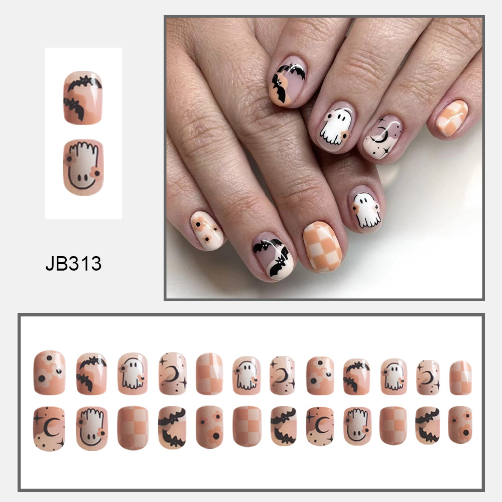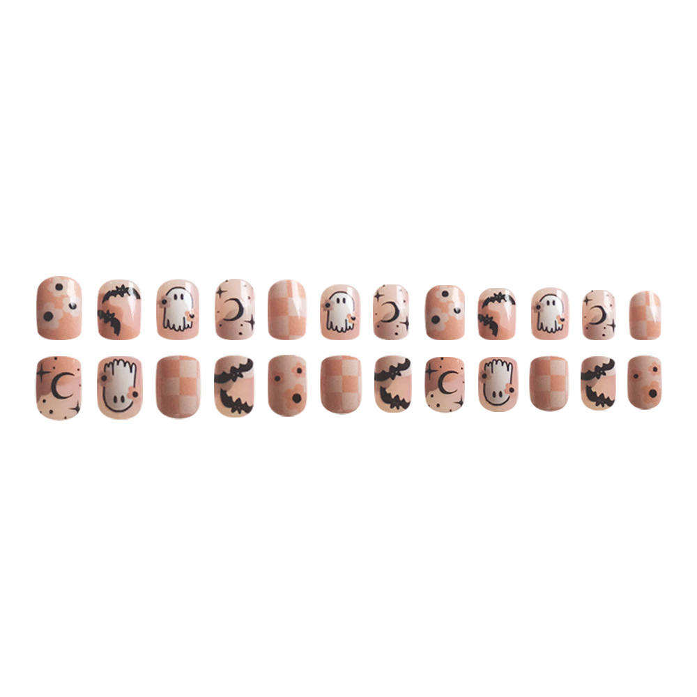 Churchf Churchf Short Square Nail Checkerboard Bat Small Ghost Halloween Element Fake Nails Finished Wear Nail Holiday Nail