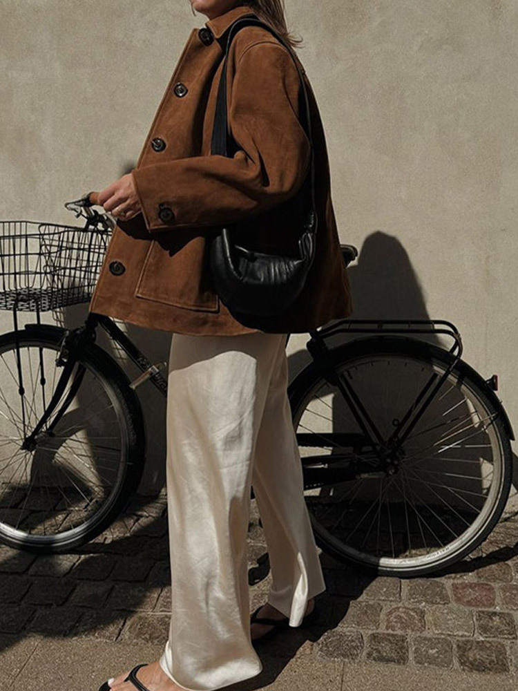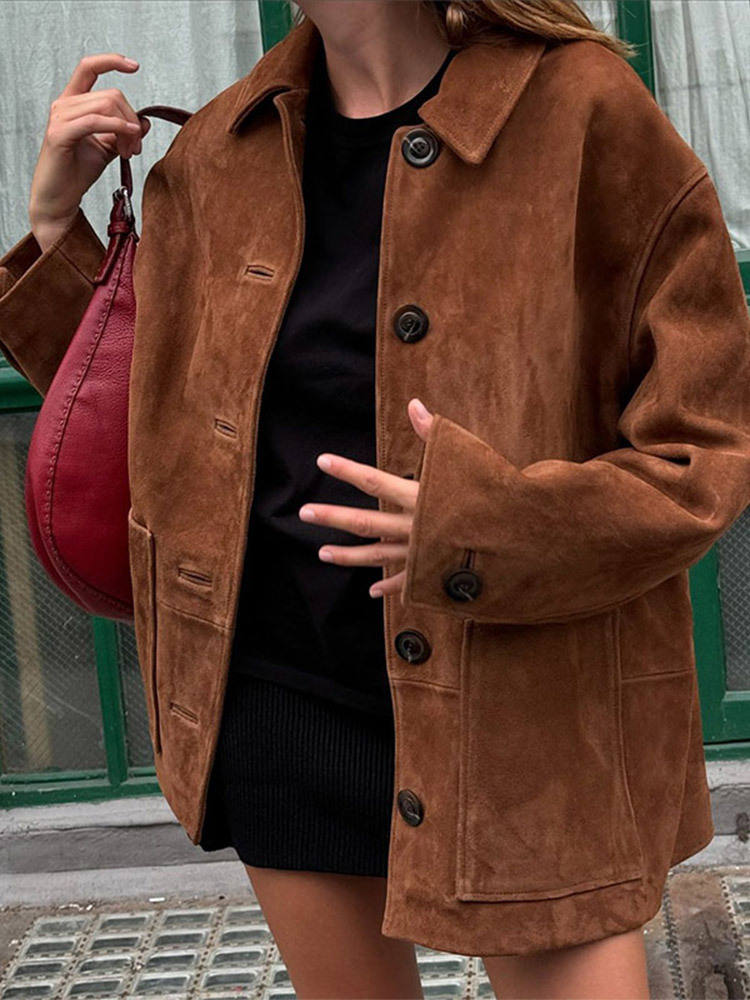 Churchf Churchf Shot-Vintage Lapel Long Sleeve Button Coat 24 Stylish Female Loose Street Style Pocket Jacket