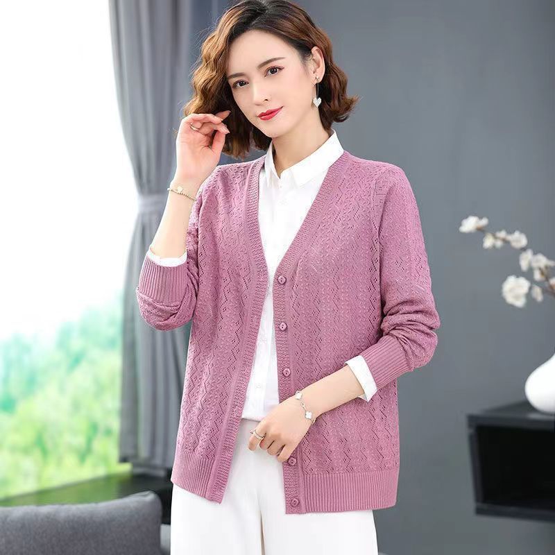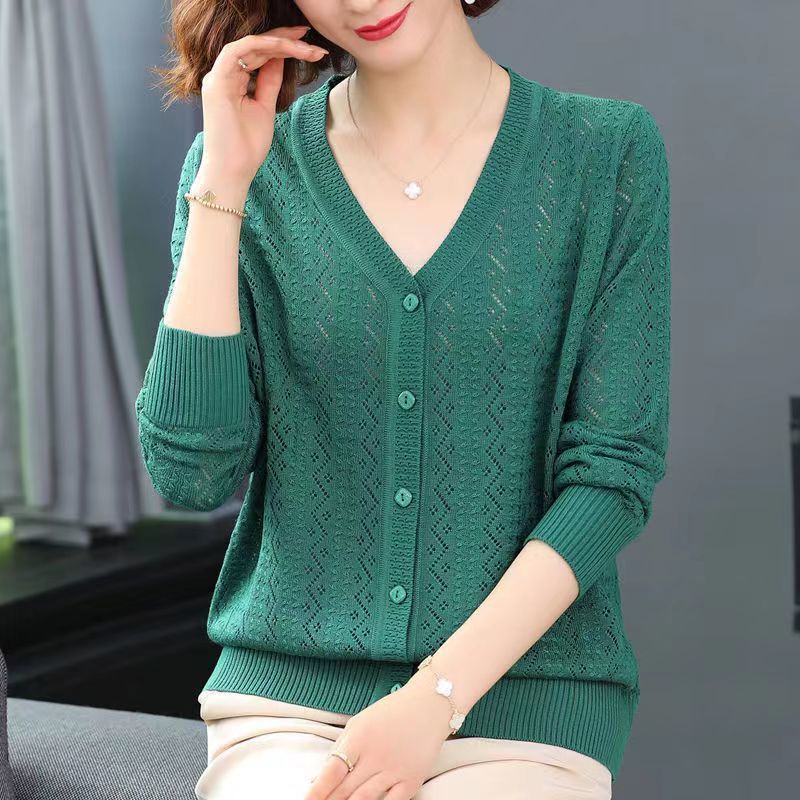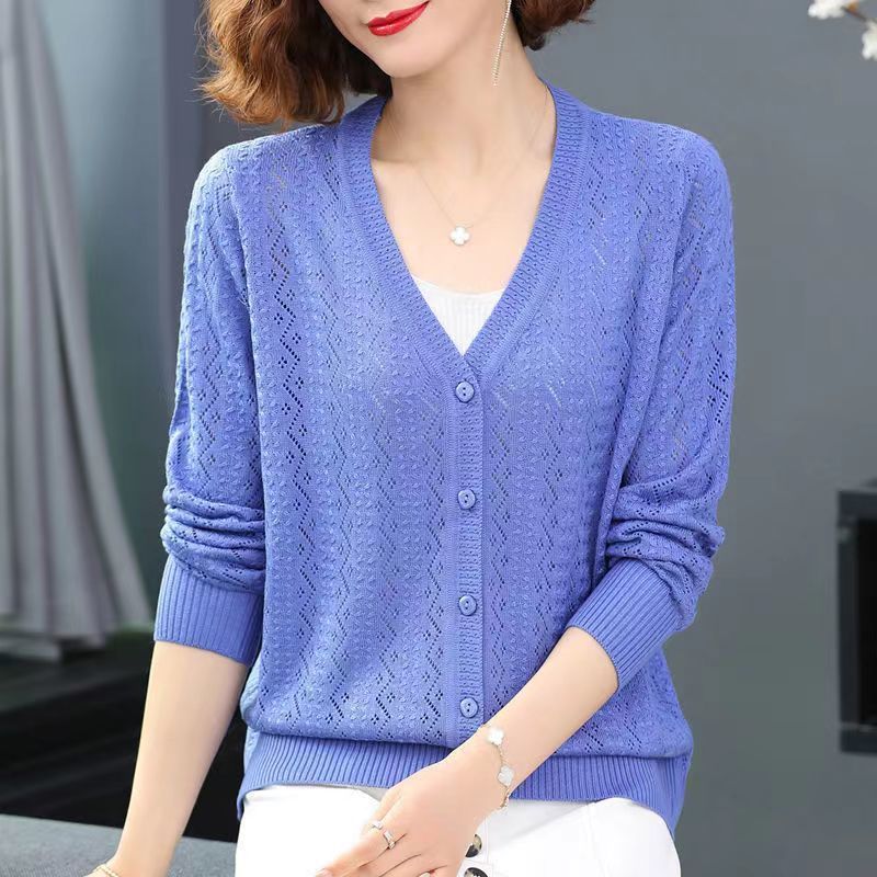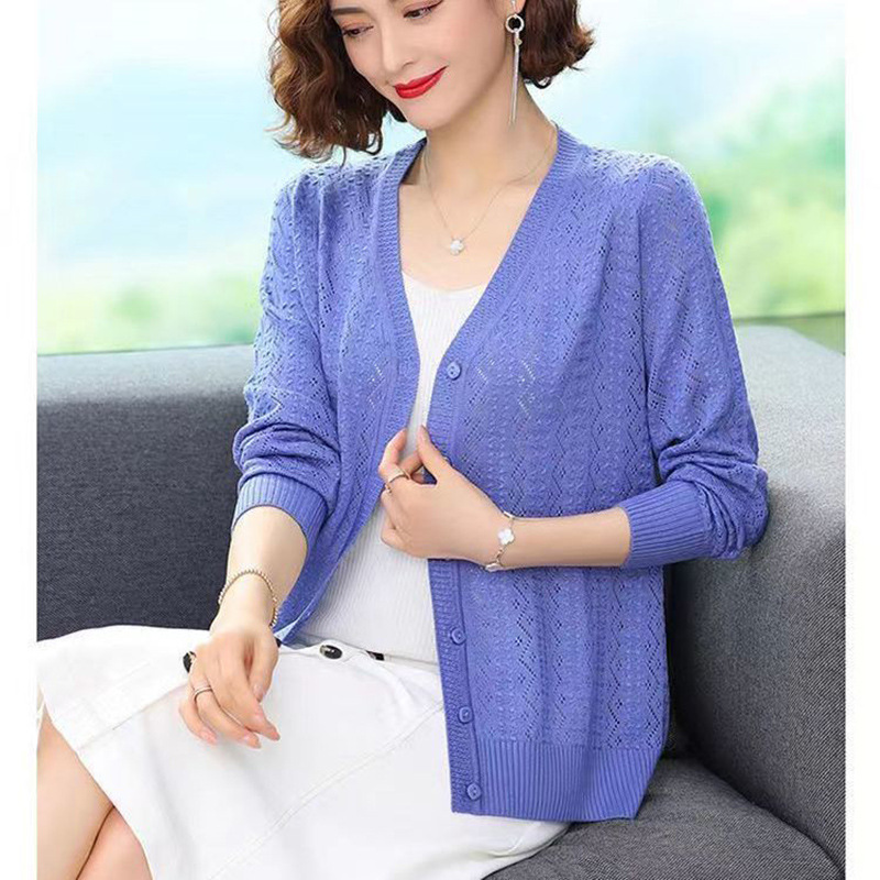 Churchf Churchf Summer Empty Hollow Coat Casual Long Sleeve Loose Knit Cardigan Women's V-Neck Thin Top