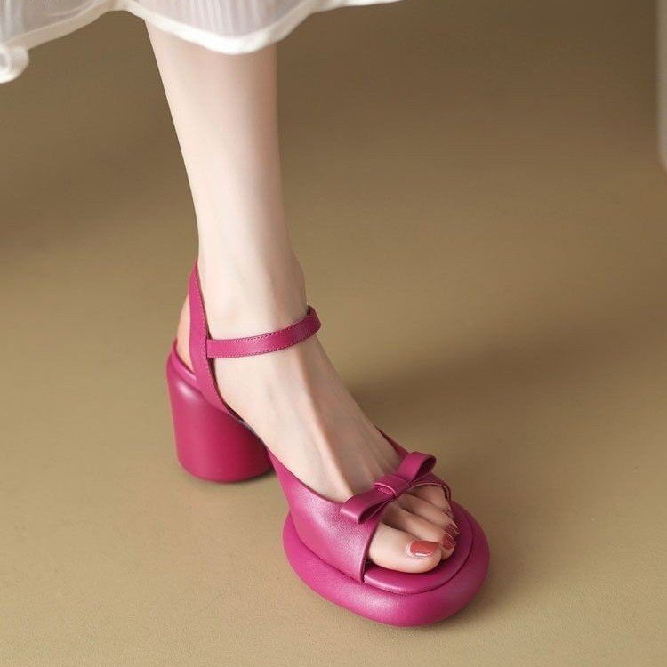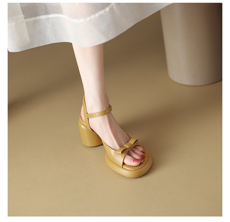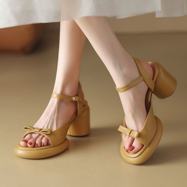 Churchf Churchf Summer New Vintage Sandals One Line Buckle Beach Sandals Round Head Bow High Heel Sandals Women