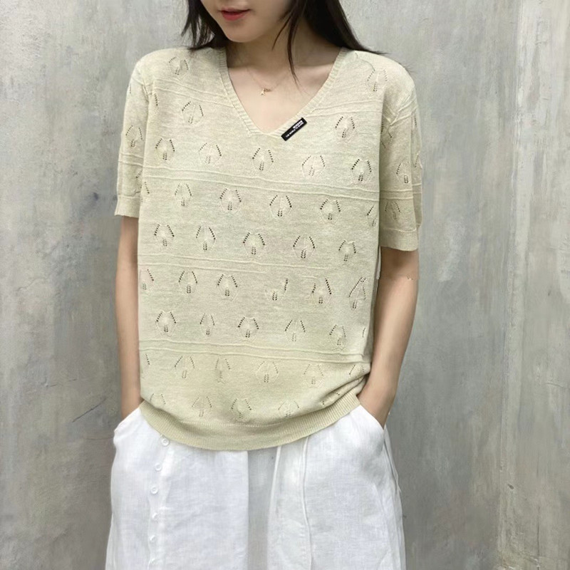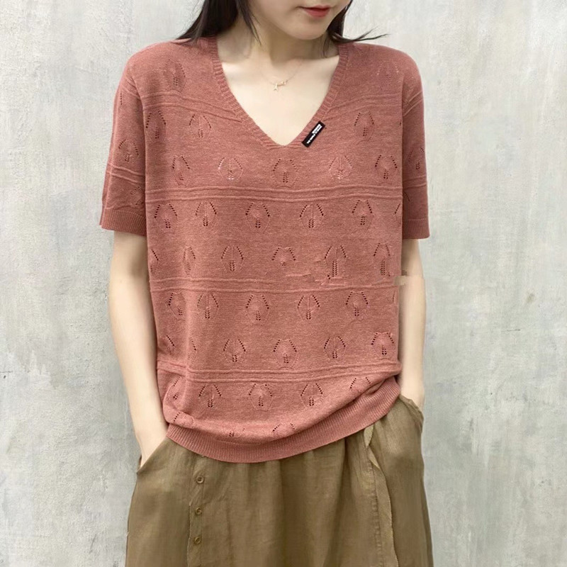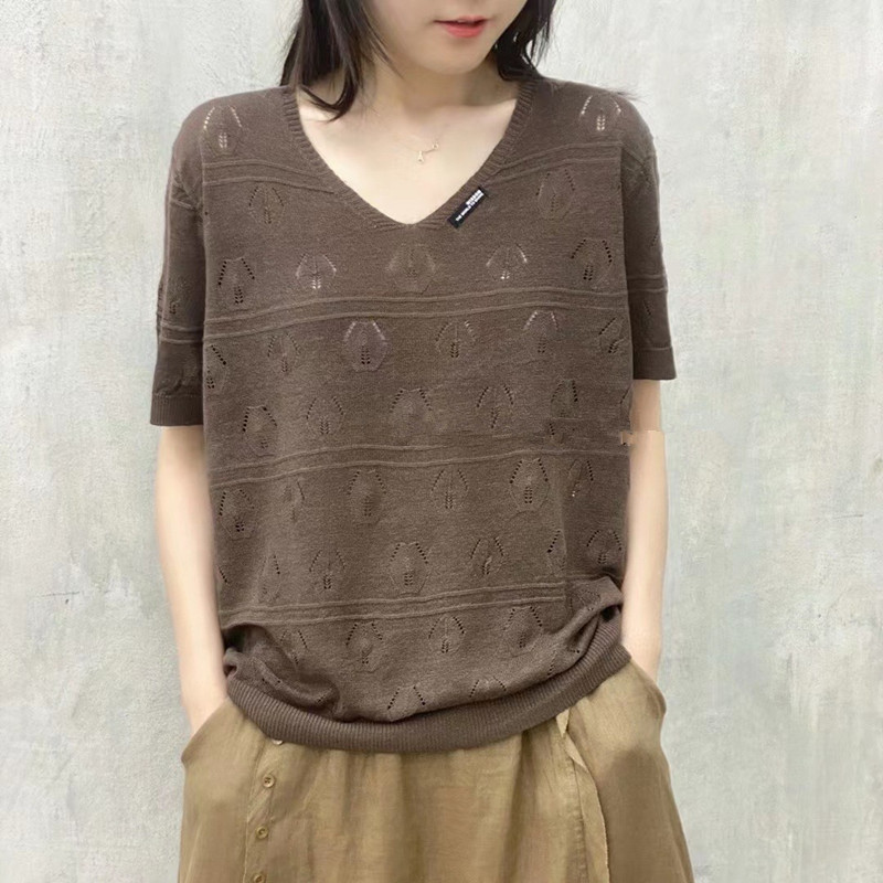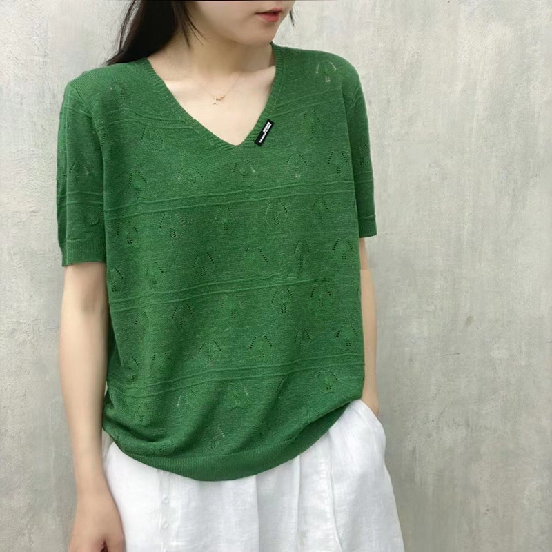 Churchf Churchf Summer Solid Color Loose Short-Sleeved Bottom Shirt Literary Casual Jacket V-Neck Knit T-Shirt Women