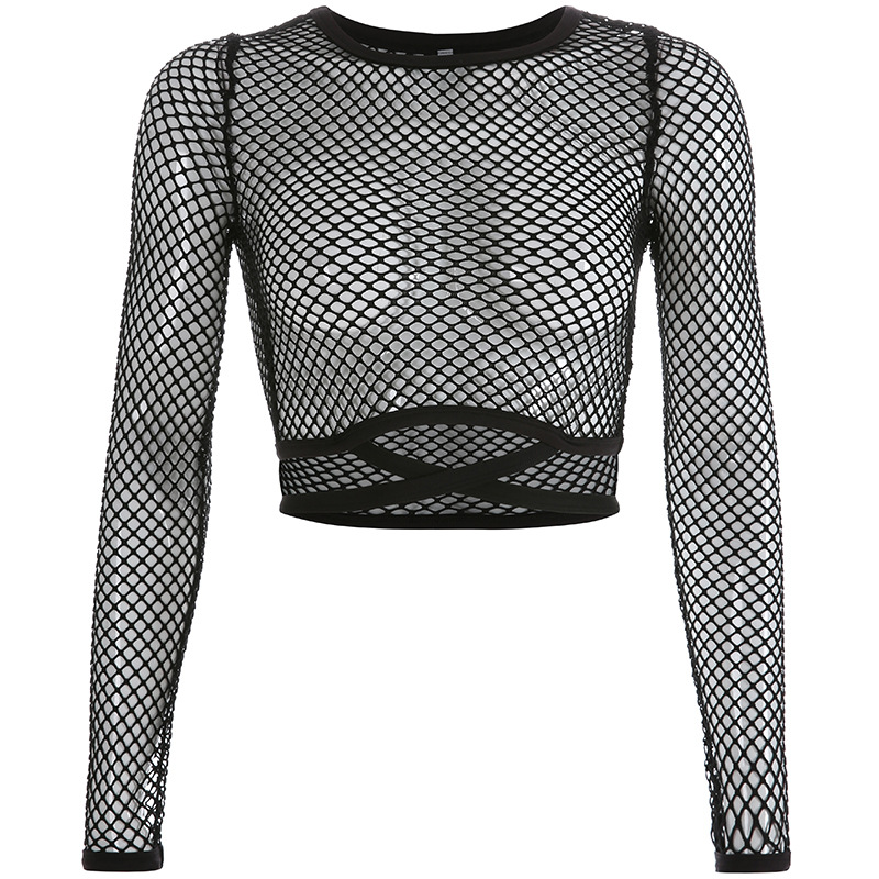 Churchf Churchf Summer Women's Wish Sexy Hollow Out Net Hole Basic Crop Umbilical Lace Long Sleeve Top T-Shirt Women