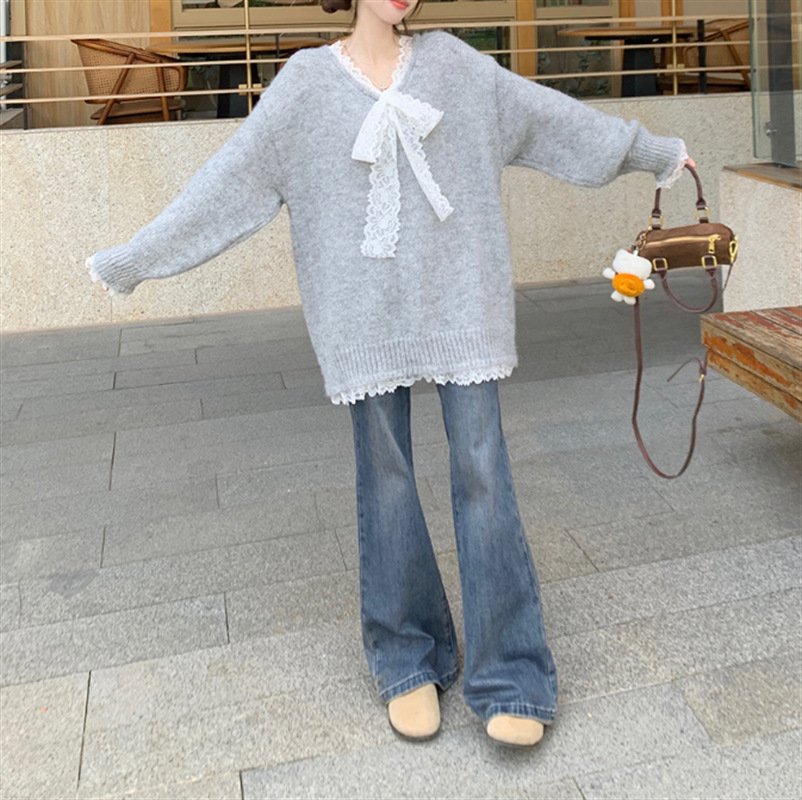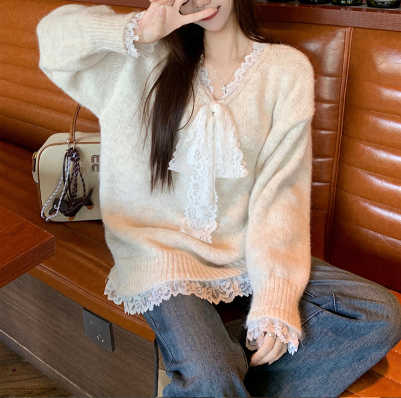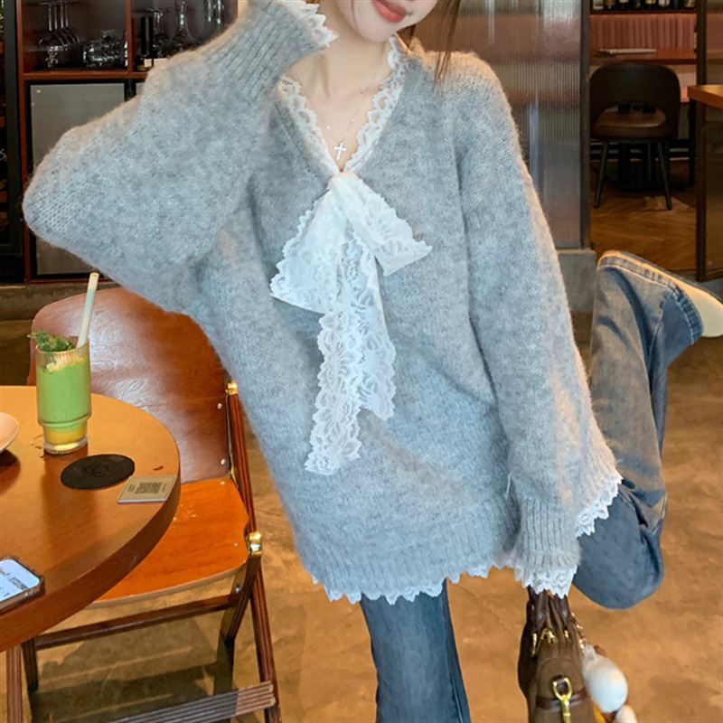 Churchf Churchf Type Advanced Feeling Catch Spell Lace Bow False Two Knit Sweater Female Autumn Dong New Style Languid Lazy Wind Bottom Sweater