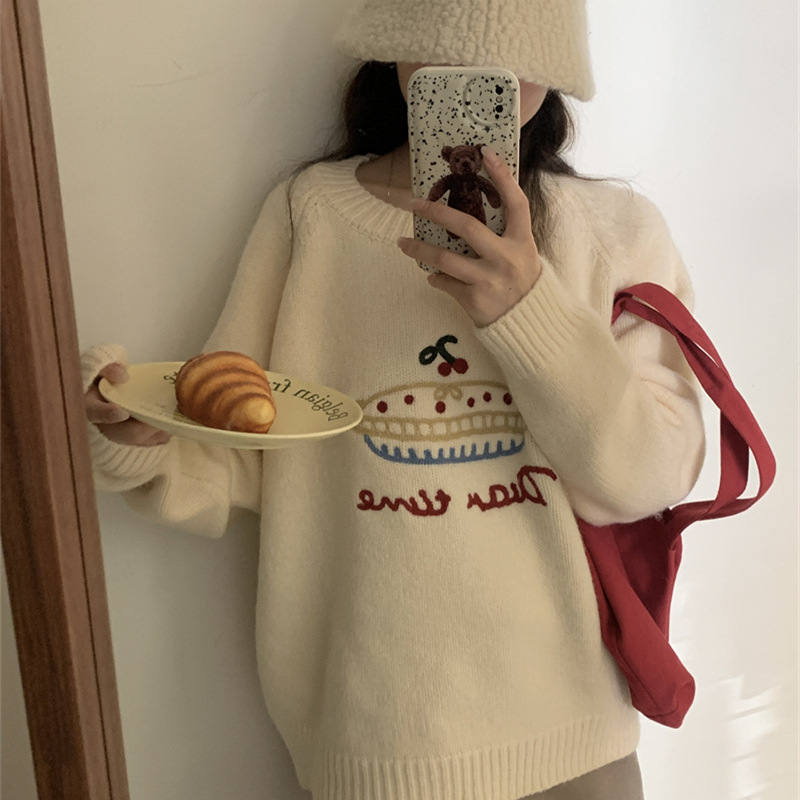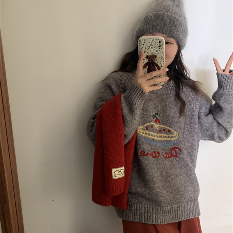 Churchf Churchf Winter 2023 Korean Version Of East Gate Round Collar Cake Jacquard Sweater Women's Fashion Loose Casual Long Sleeve Knitting