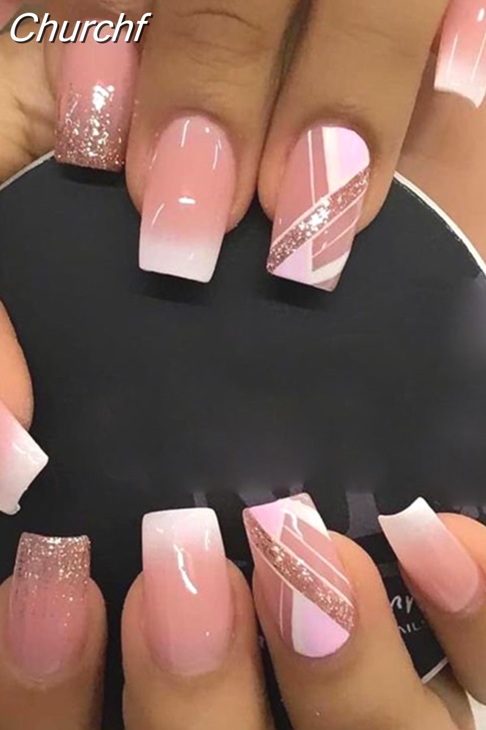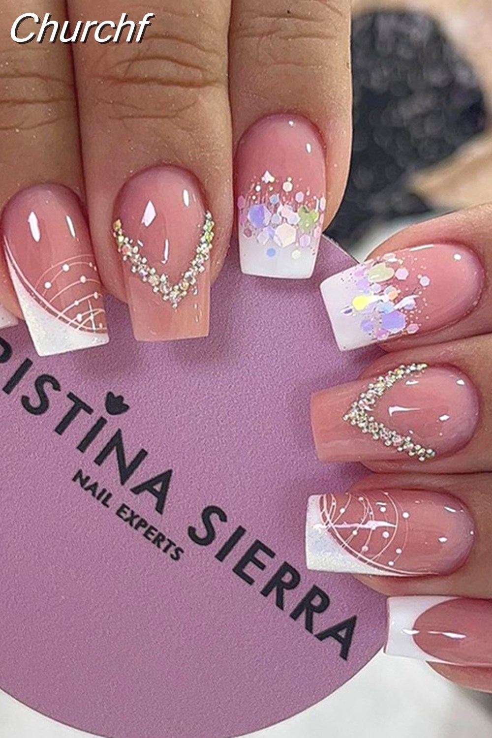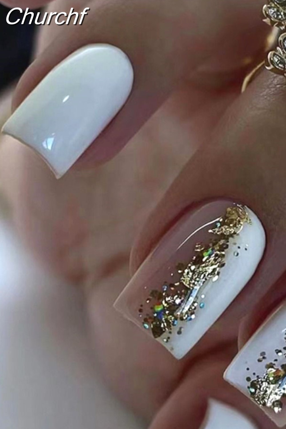 Churchf Drill False Nails Set Simple French Short Square Head Nails Manicure Fashion Full Cover Fake Nail Tips Press on Nails-Nail Inspo