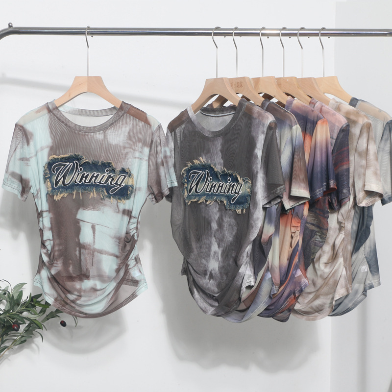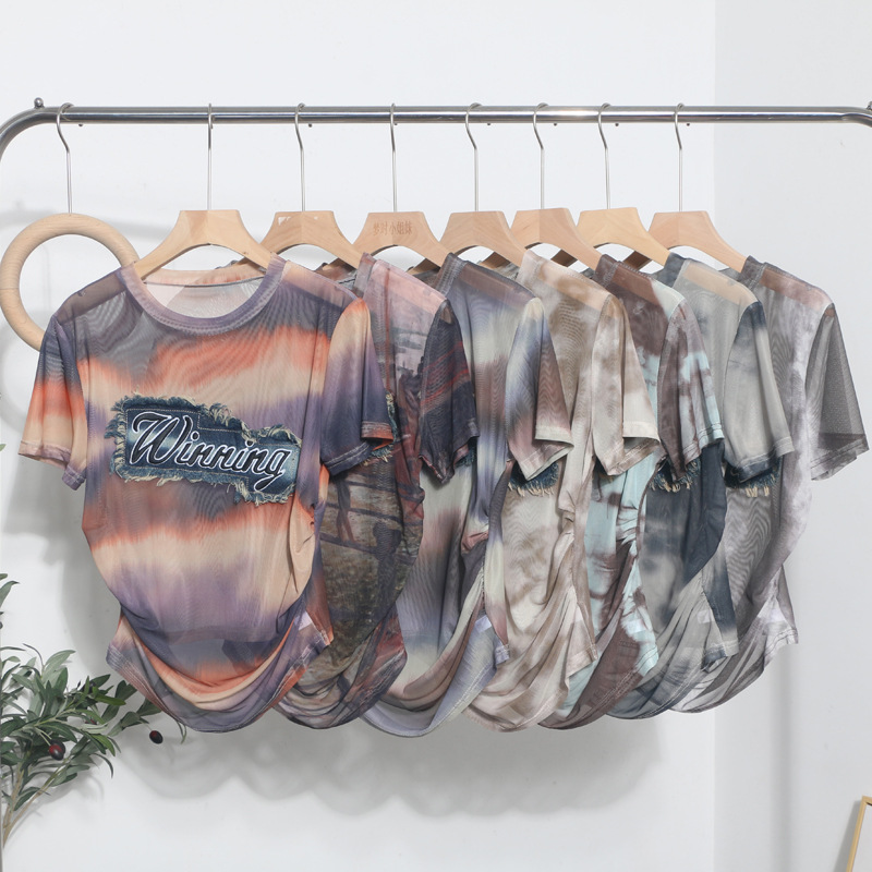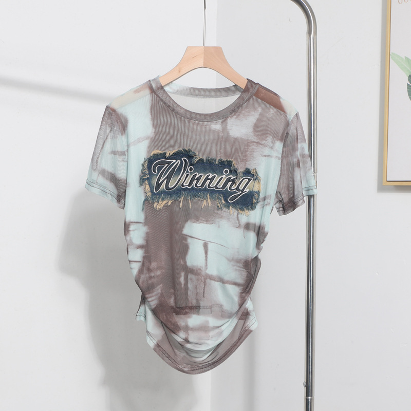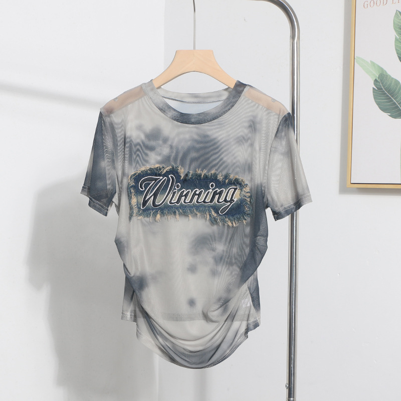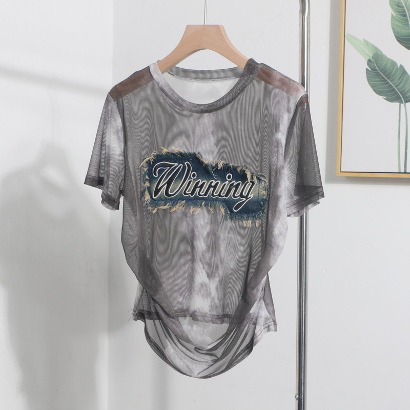 Churchf Real Shooting Embroidery With Straight Shoulder Short-Sleeved Mesh T-Shirt Fold Irregular Perspective Hood Top 25821