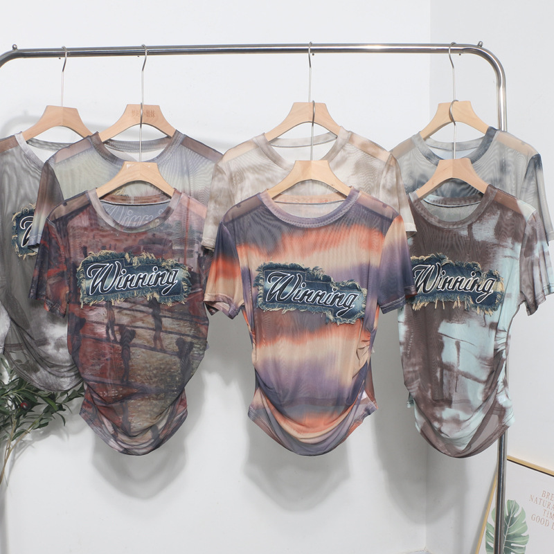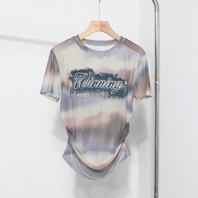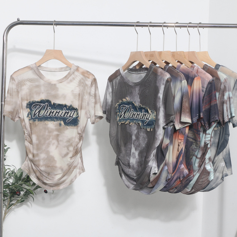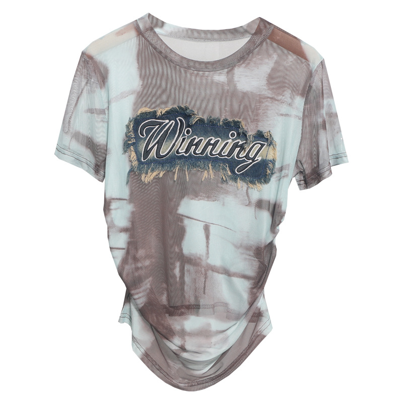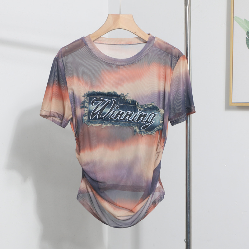 Churchf Real Shooting Embroidery With Straight Shoulder Short-Sleeved Mesh T-Shirt Fold Irregular Perspective Hood Top 25821