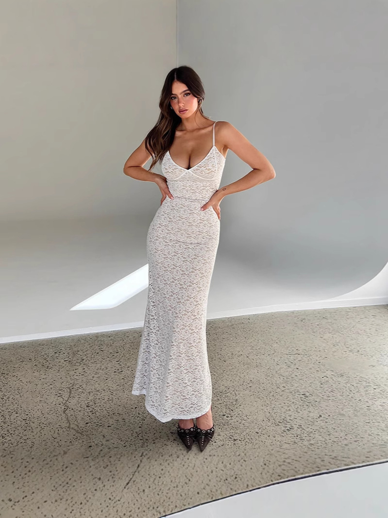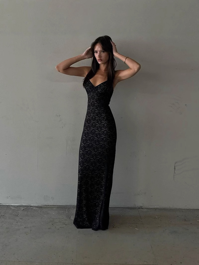 Churchf Suspension Lace Splicing Perspective Dress Body Solid Color Dew Back Sexy Dress Woman
