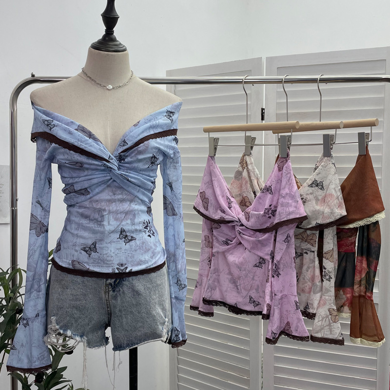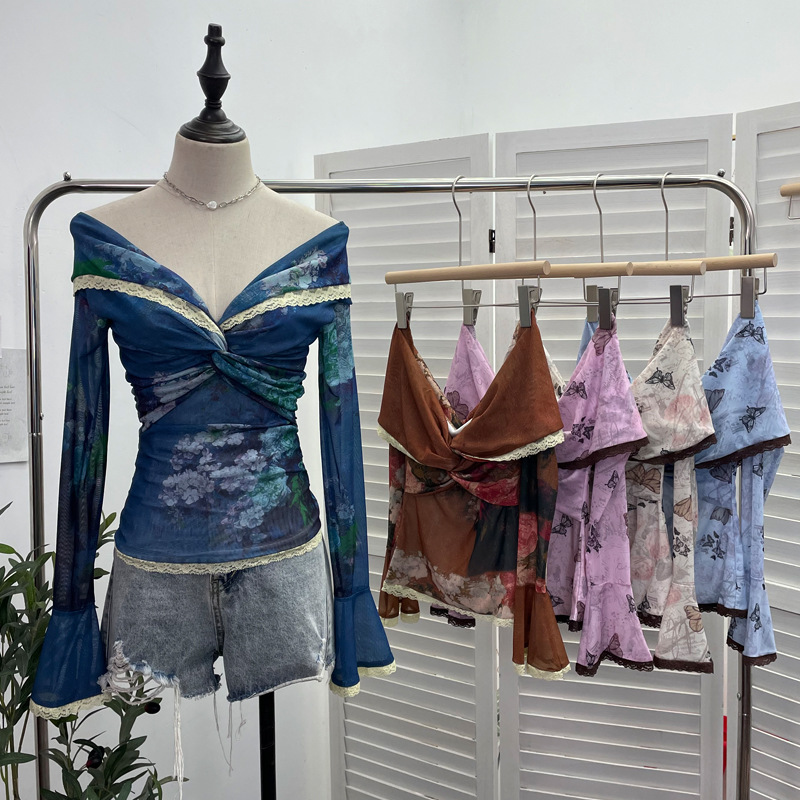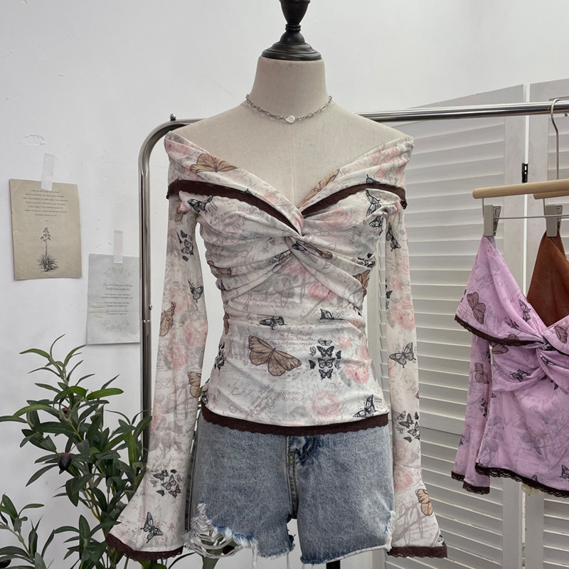 Churchf Vintage Oil Painting Print Collar A Word Twisted Folded Short-Sleeved Trumpet Blouse 9907