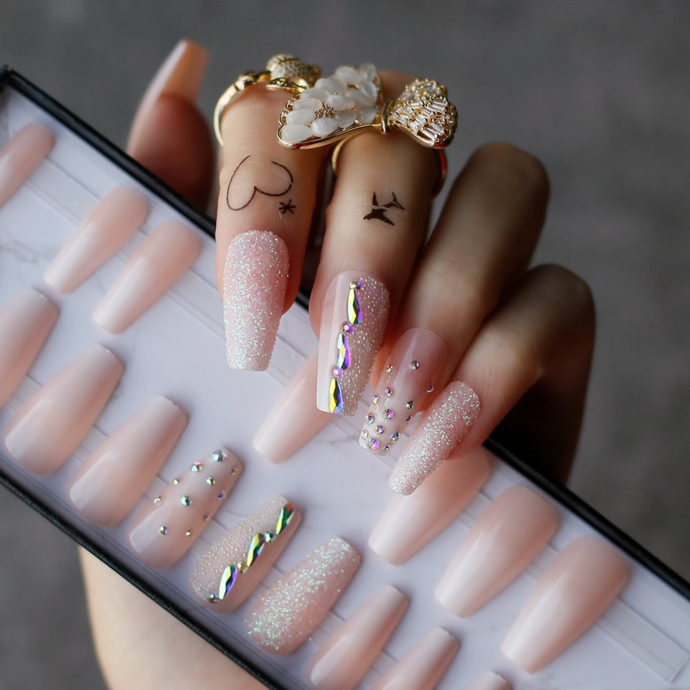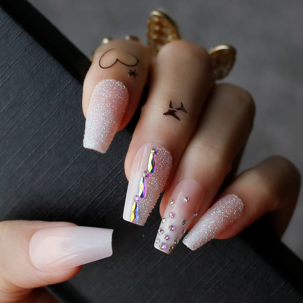 Coffin Acrylic Ombre False nails baby boom cute French glitter Ballet rhinestones Press on nails with Black box Glossy caviar-Nail Inspo
