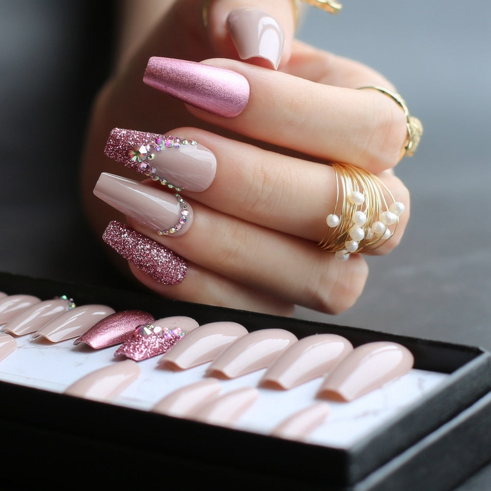 Coffin Fake nails handmade V french glitter nude color gel glossy match metal 3d rhinestones-Nail Inspo