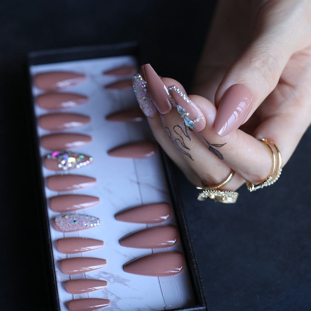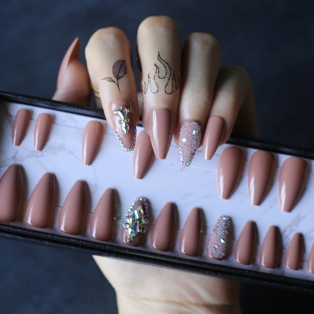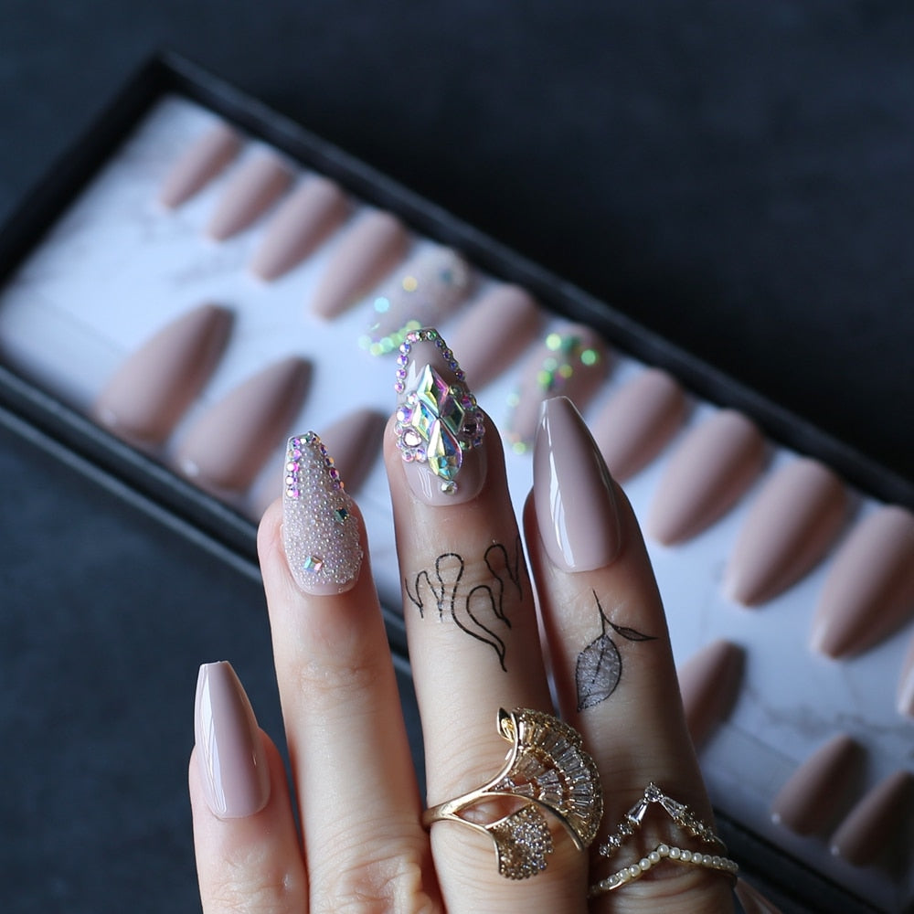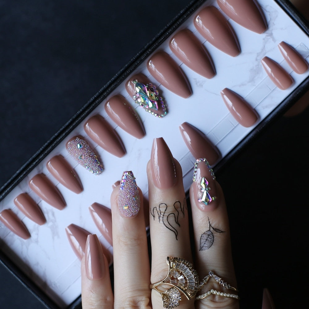 Coffin Nude Glossy Press on nails with box AB holographic Crystal caviar Fake nails Gel Cover False nails Ballet buff tan-Nail Inspo