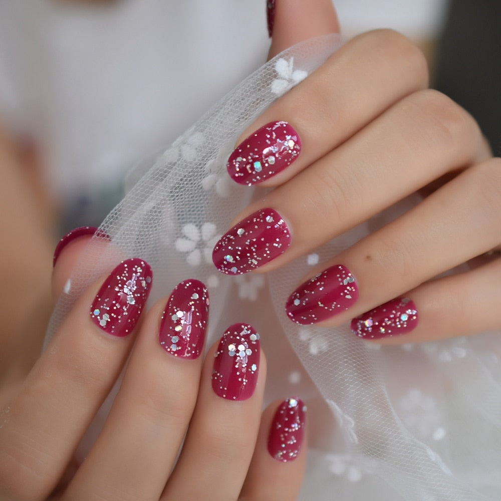 Deep Rose Red Press On Fingernails Mix Glitter Decoration Oval Fake Nails UV Polish Cover Glossy Nail Art Tips 24-Nail Inspo