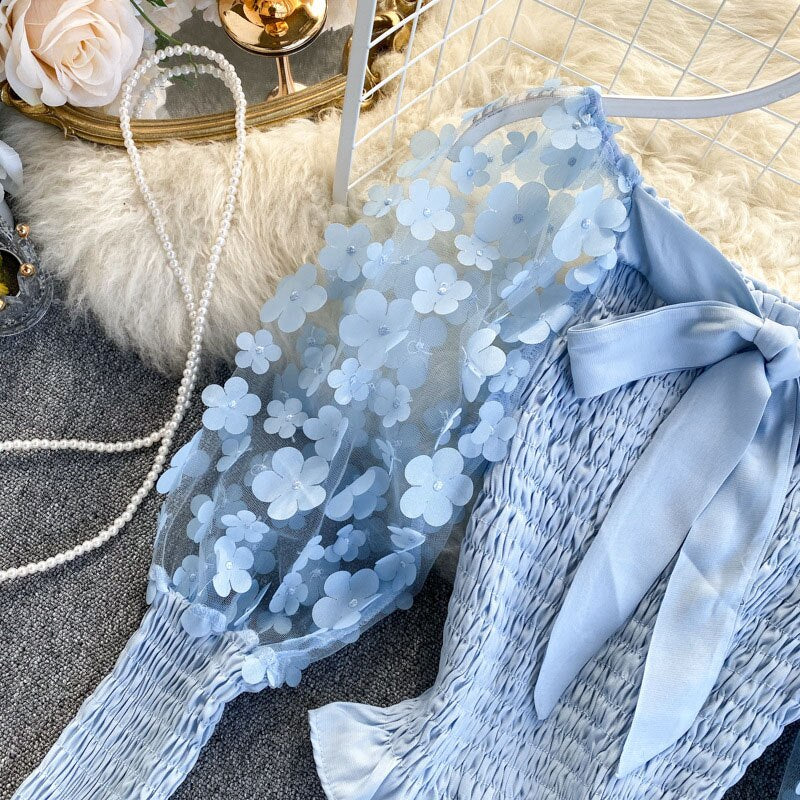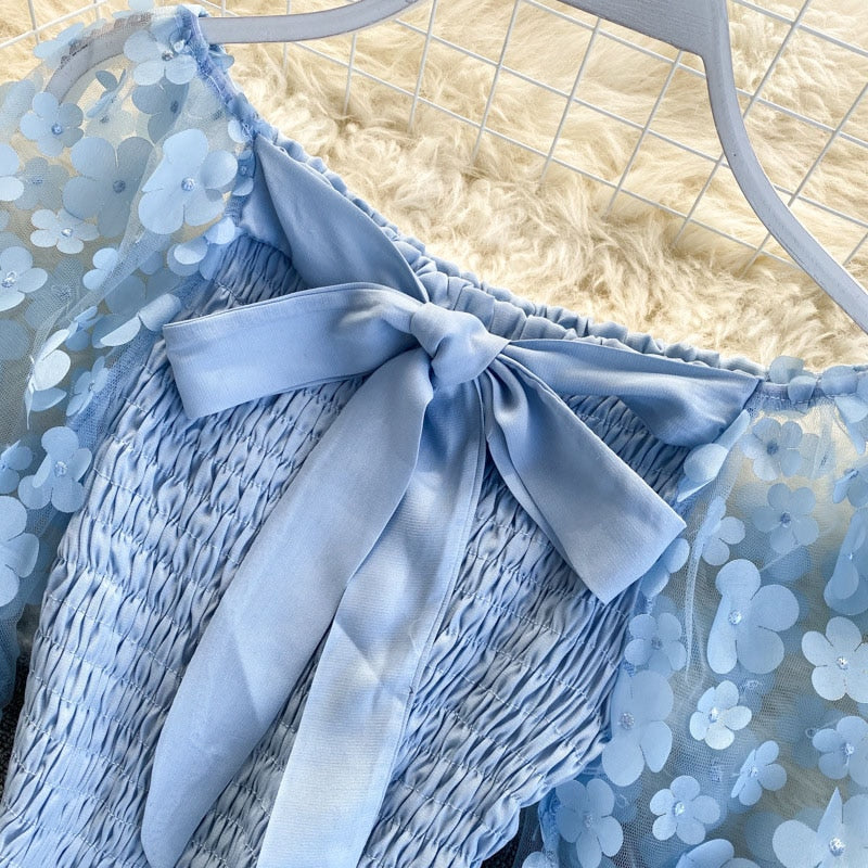 Elegant Spring Summer Women Short Shirt Sweet 3D Flower Appliques Mesh Crop Tops Slash Neck Puff Long Sleeve Ladies Blouse