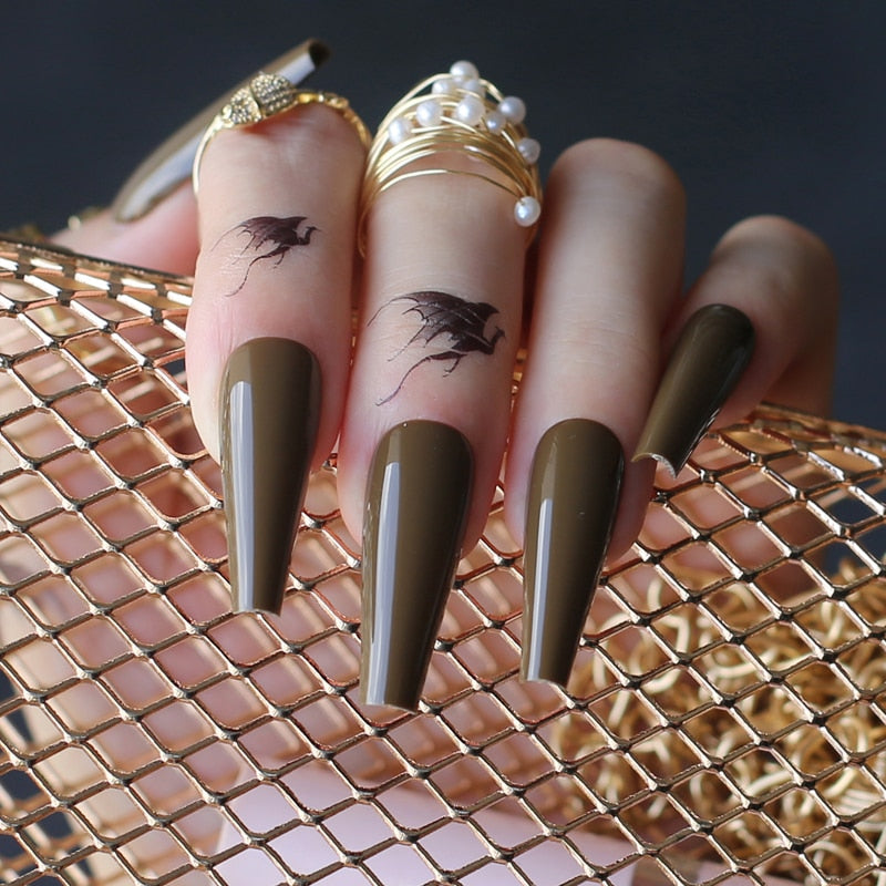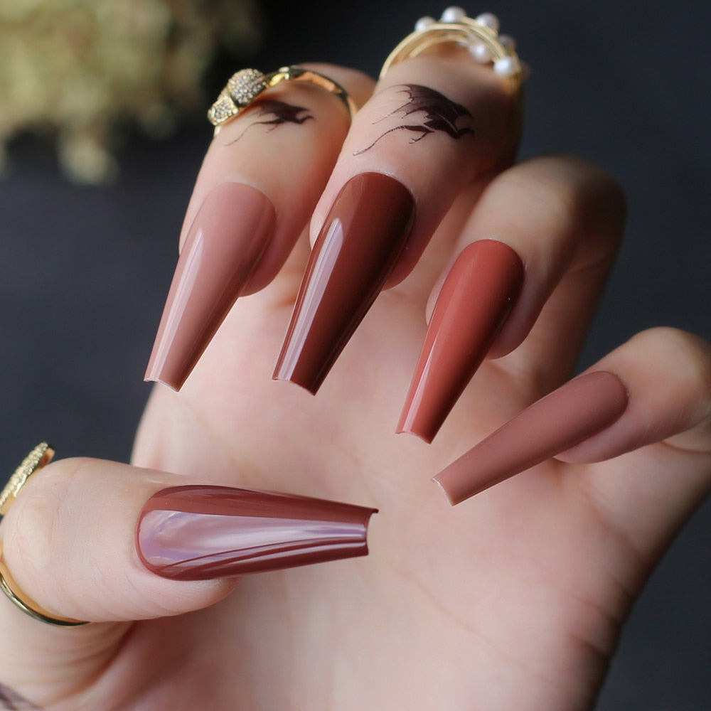 Extra gel Burgundy fasle nails Nude Long Luxury Coffin coffee Acrylic nails salon 24pcs fake nails ballet UV glossy available-Nail Inspo
