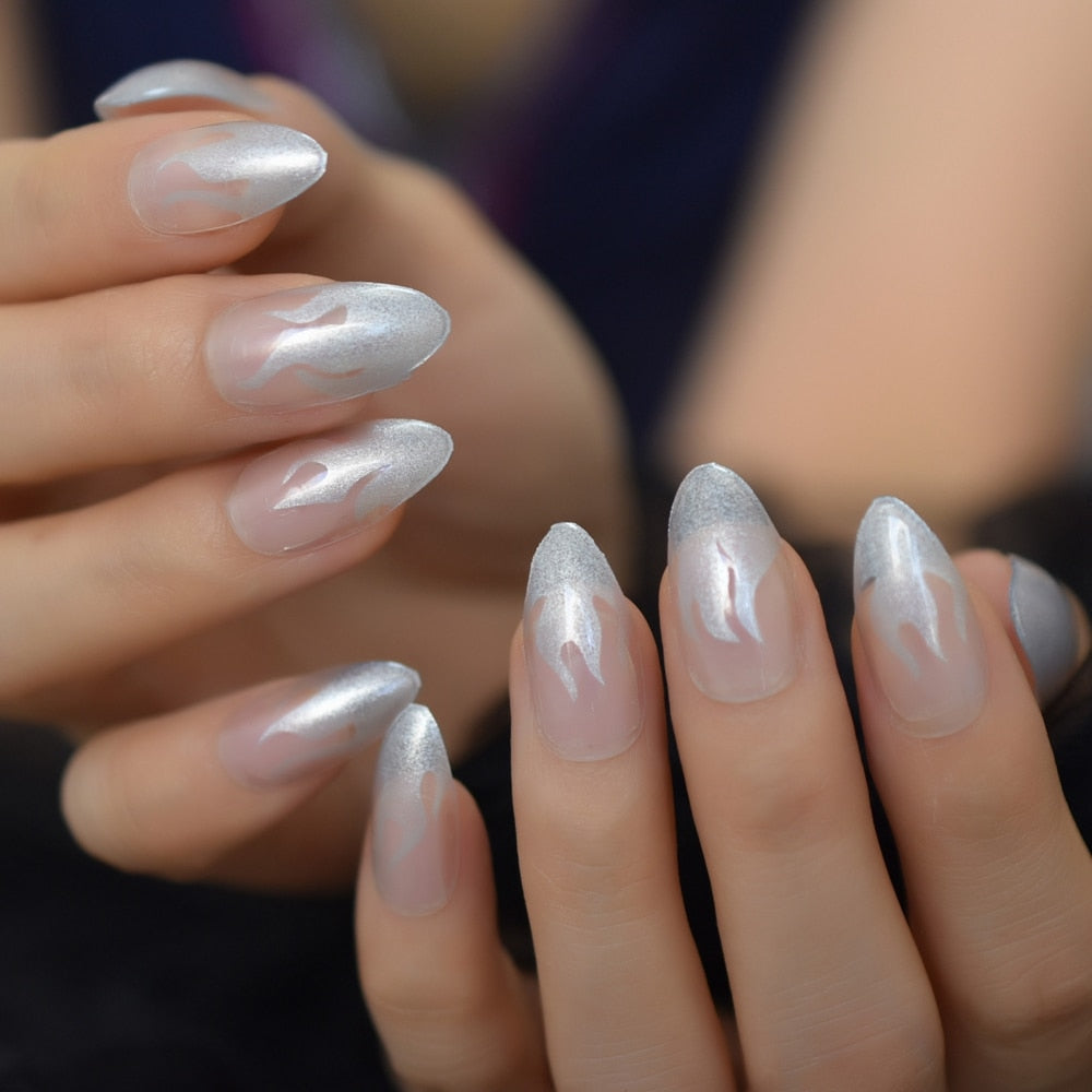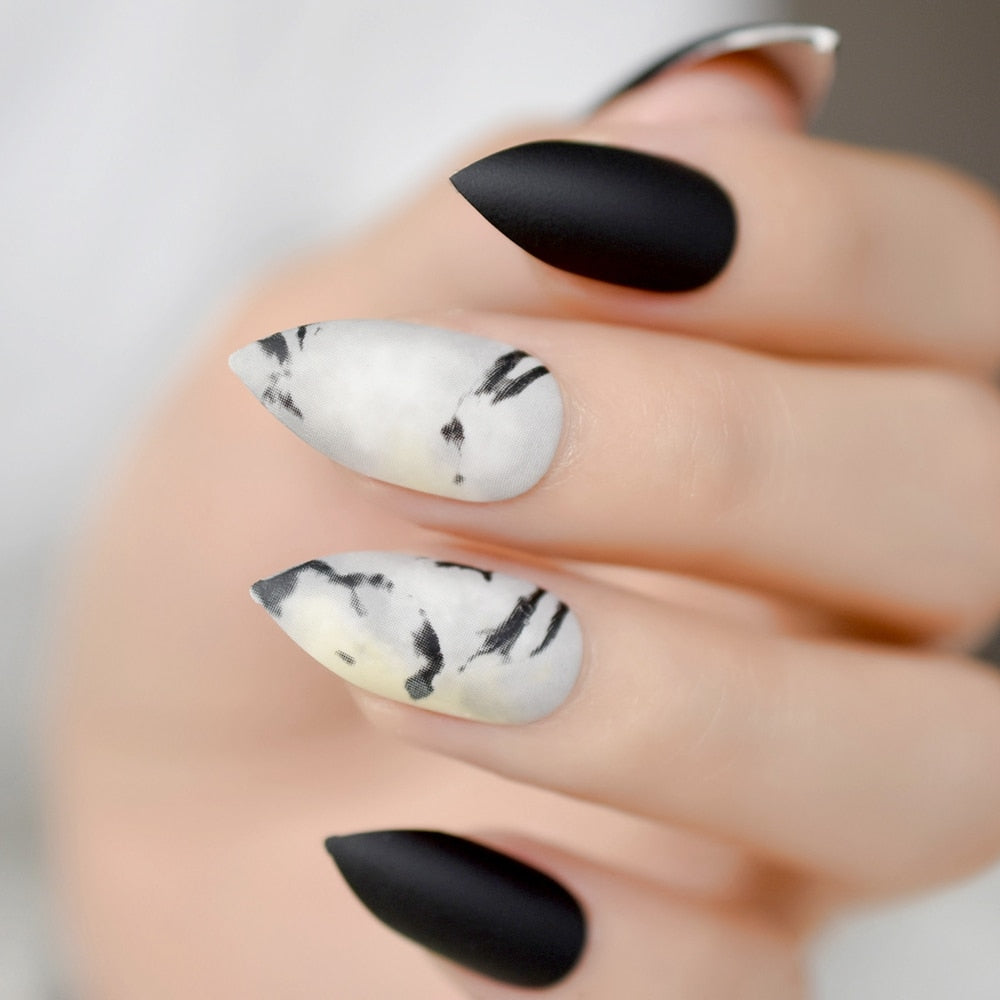 Extra long Stiletto Grey Marble Fake Nails Stone Pattern Pointed Dark Shiny Long Press On False Nails for Finger 24 Count-Nail Inspo