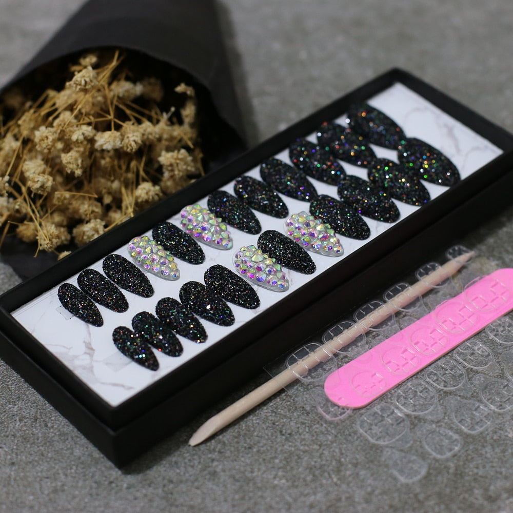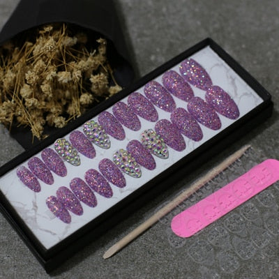 Full crystal diamond handmade fake nails black glitter blue 24pcs Full set wedding nails purple gold silver coffee false nails-Nail Inspo