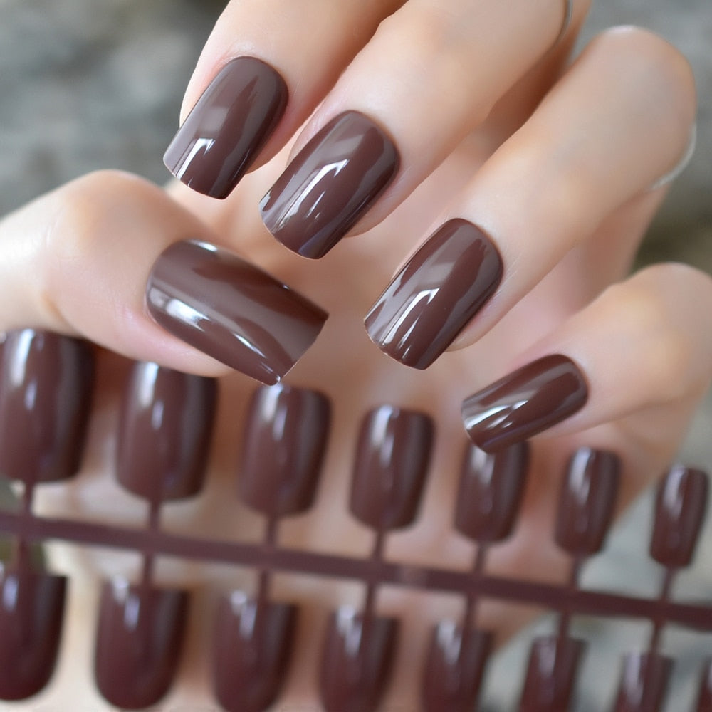 gel Square Faux ongles Dark Chocolate Brown Medium-long False Nails Cool DIY Manicure Tips 24pcs/kit-Nail Inspo