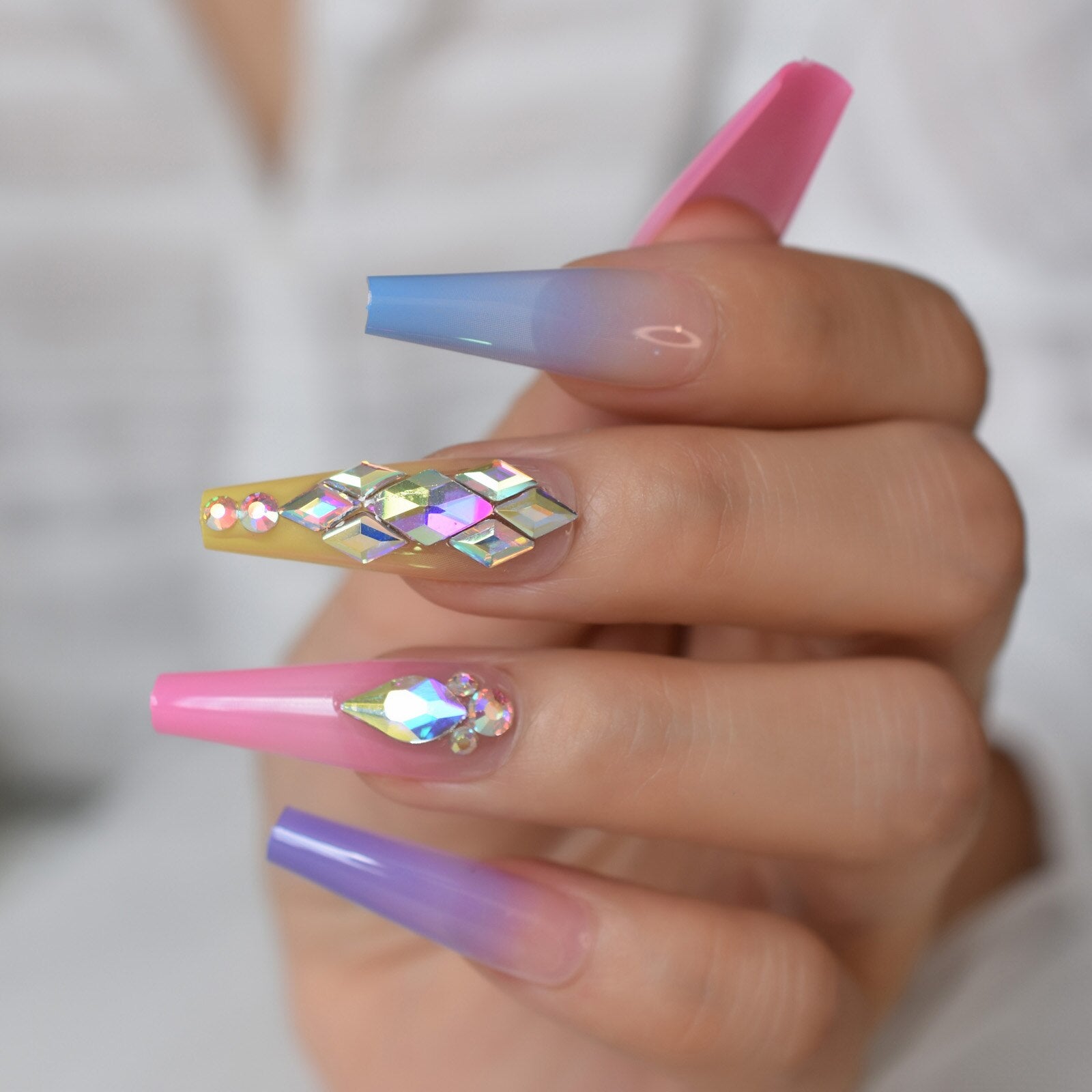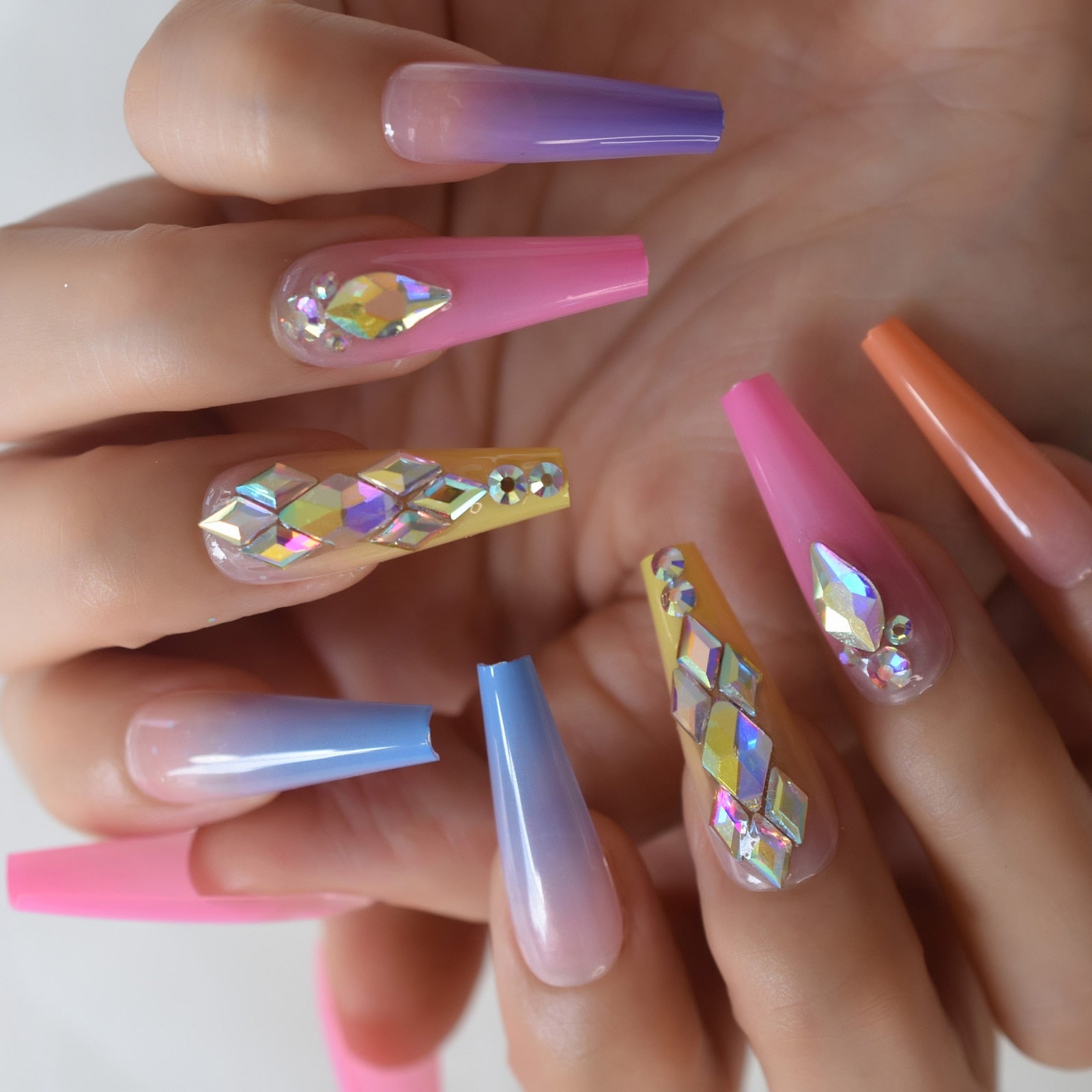 Gorgeous Rainbown Nails Coffin Shape 3D Crystal Decorative Faux Ongles Ombre Pink Blue Yellow Fashion Fake Nails Tip-Nail Inspo