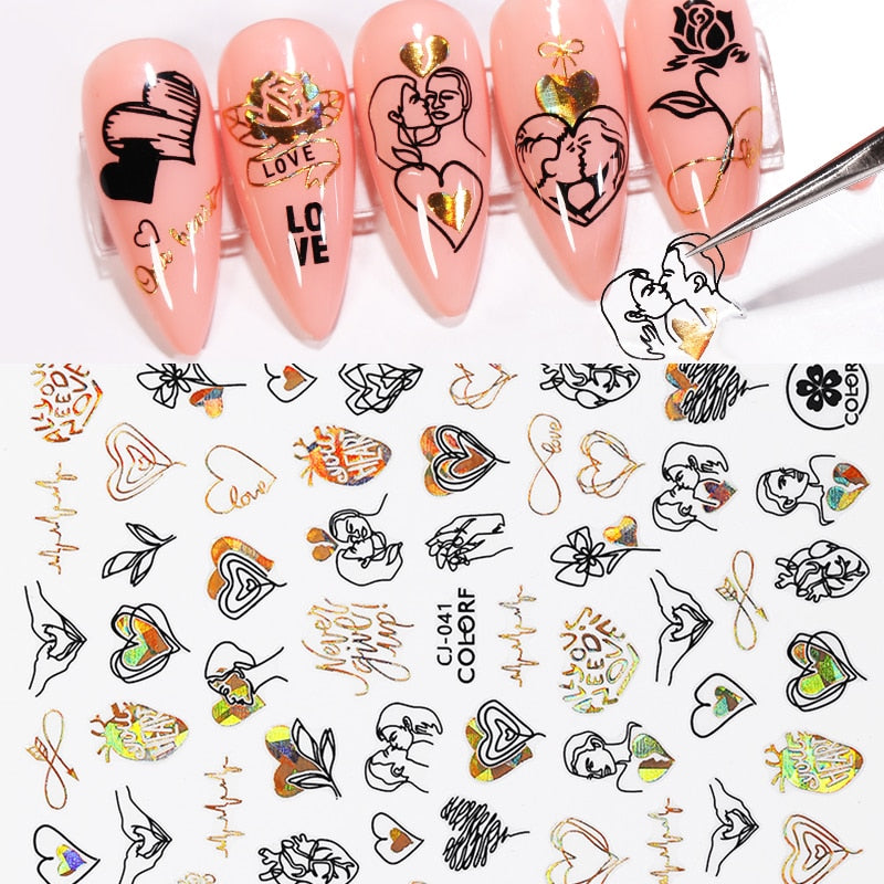 Hearts Love 3D Nail Sticker Laser Gold Rose Flower Snowflake Cartoon Line People Slider Design Polish Nail Decals Nail Art Decor-Nail Inspo